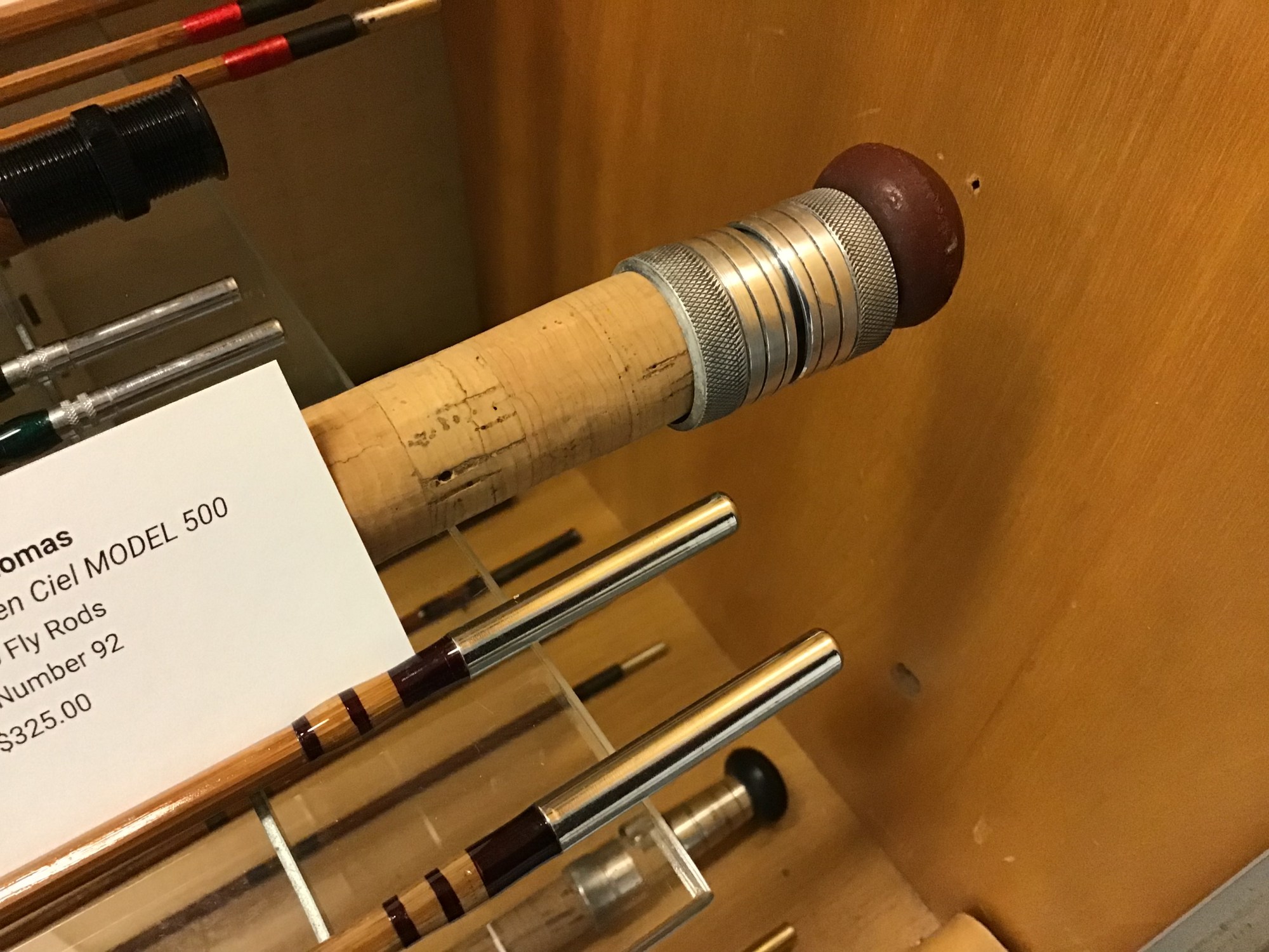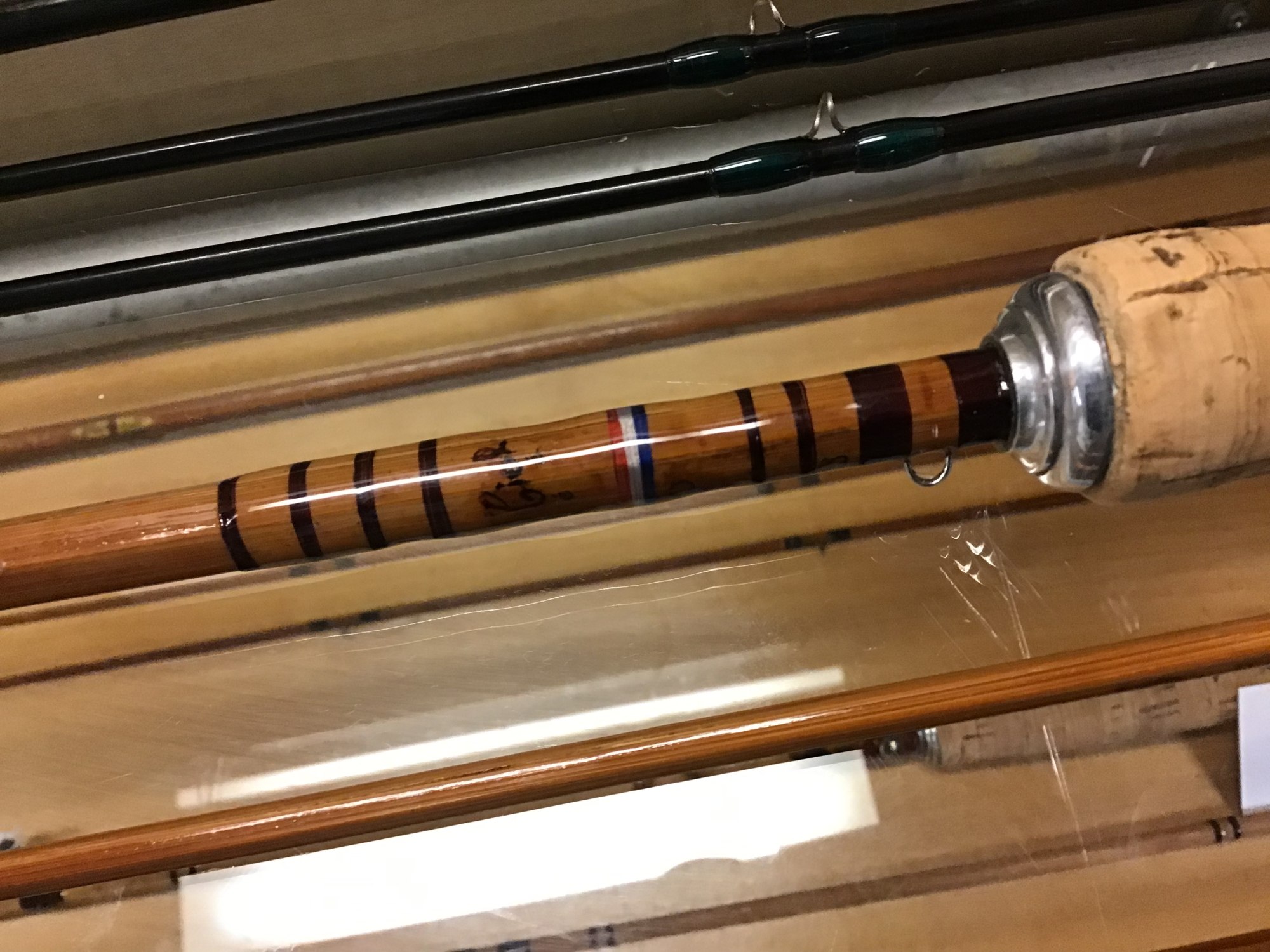 6 foot 4 inch 2 piece with a fly rod tip and a spinning rod tip. Thread wraps are in merlot silks and double tipping with the traditional "French flag wraps" all with two part high gloss epoxy finish. The rod has it's original grip and reel seat and replacement tips as they didn't travel time like the original butt section. The rod is fitted with an Australian walnut ferrule plug. The rod has been fitted with an agate stripping guide.