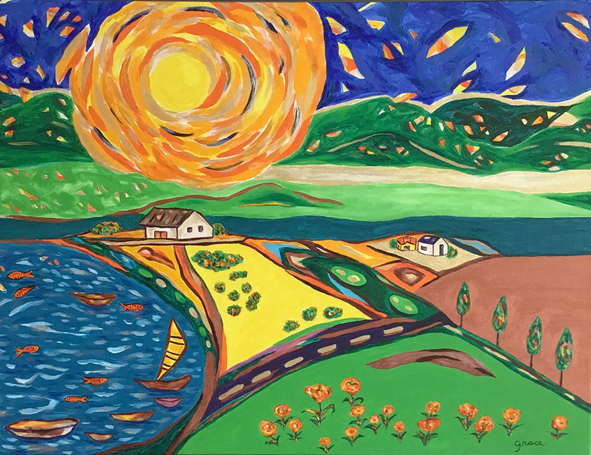 Nature sustains us and also lifts our spirits. My "Radiance of Nature" painting conveys with brilliant color, the exuberant vitality of an imaginative and captivating world. I want to express the joy, brightness, and warmth of the sun's radiance and its power to reveal brilliant color and spirit. The sun represents enlightenment for life's journey, bringing us happiness, hope, and peace.