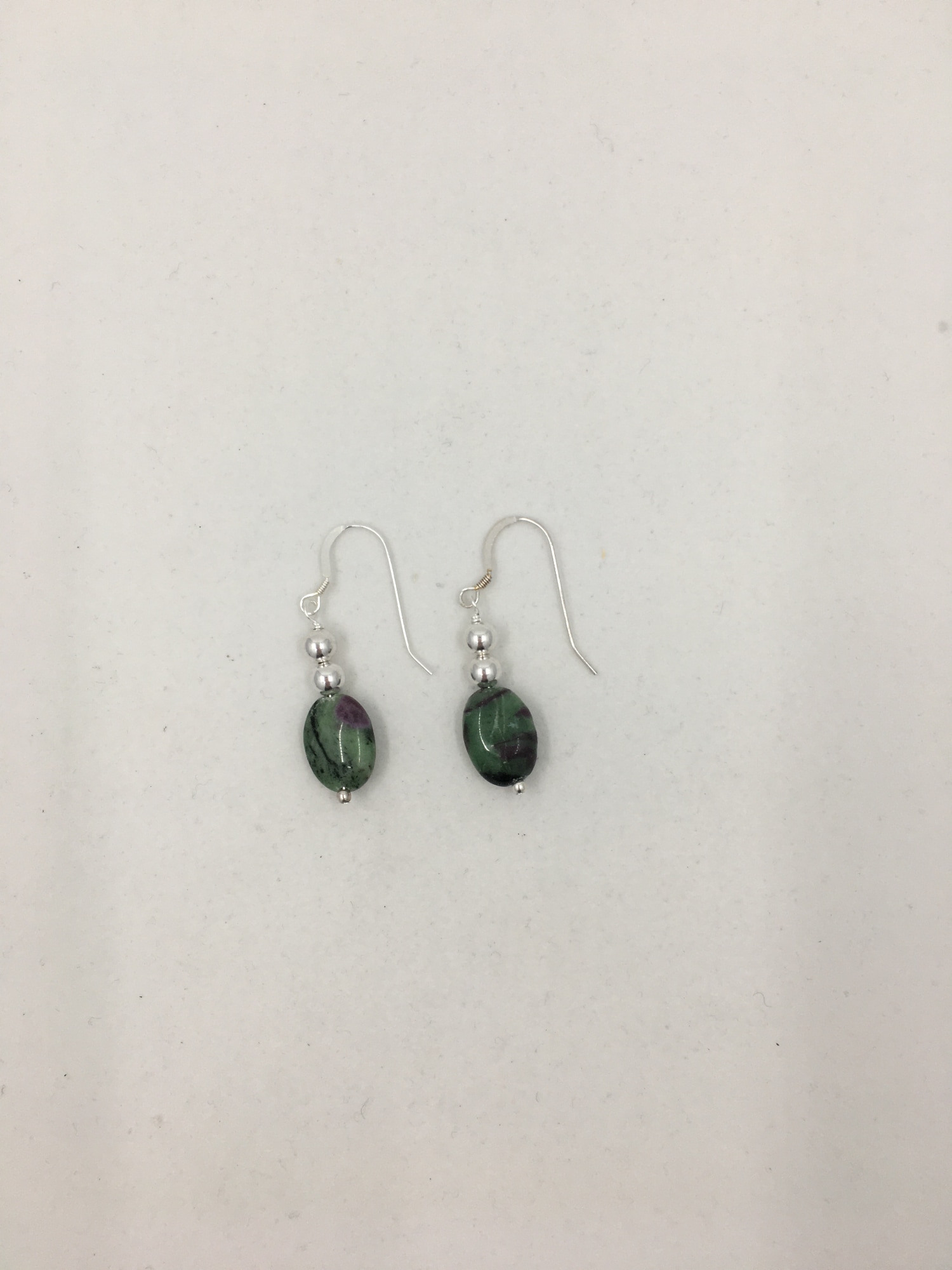 Earrings of polished ruby-in-zoisite ovals measuring 10 x 13mm with 5mm and 2mm sterling silver beads on sterling silver ear wires for pierced ears. Drop is 1”. Ruby-in-zoisite is from Tanzania.