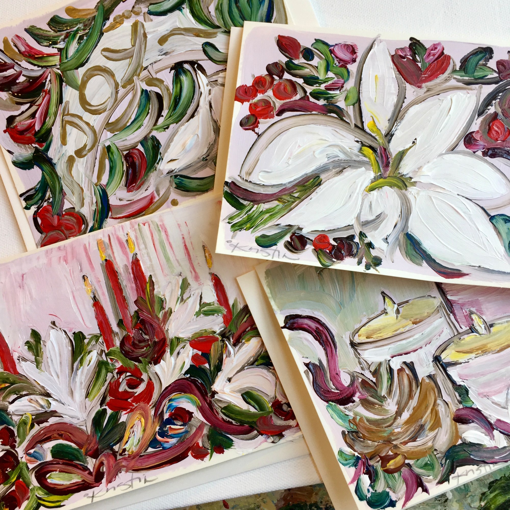Original hand painted greeting cards 6.5x5 folded size, on heavy card stock quality paper with matching envelopes. Presented in clear plastic sleeves to protect painting before purchase. Lovely to send with a stamp as a gift through the mail or to give to loved ones receiving care. Perfect size to frame to add a little art!