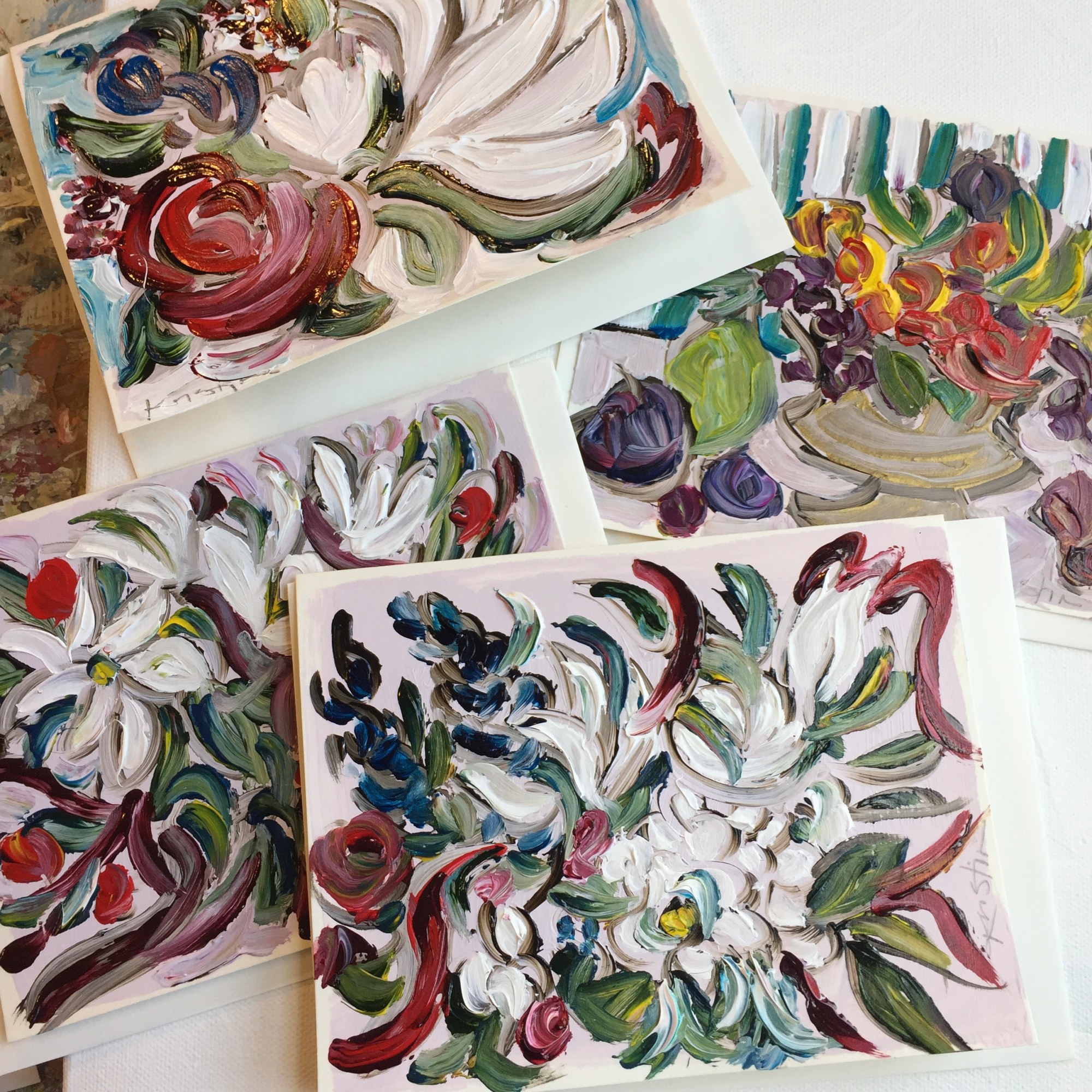 Original hand painted greeting cards 6.5x5 folded size, on heavy card stock quality paper with matching envelopes. Presented in clear plastic sleeves to protect painting before purchase. Lovely to send with a stamp as a gift through the mail or to give to loved ones receiving care. Perfect size to frame to add a little art!