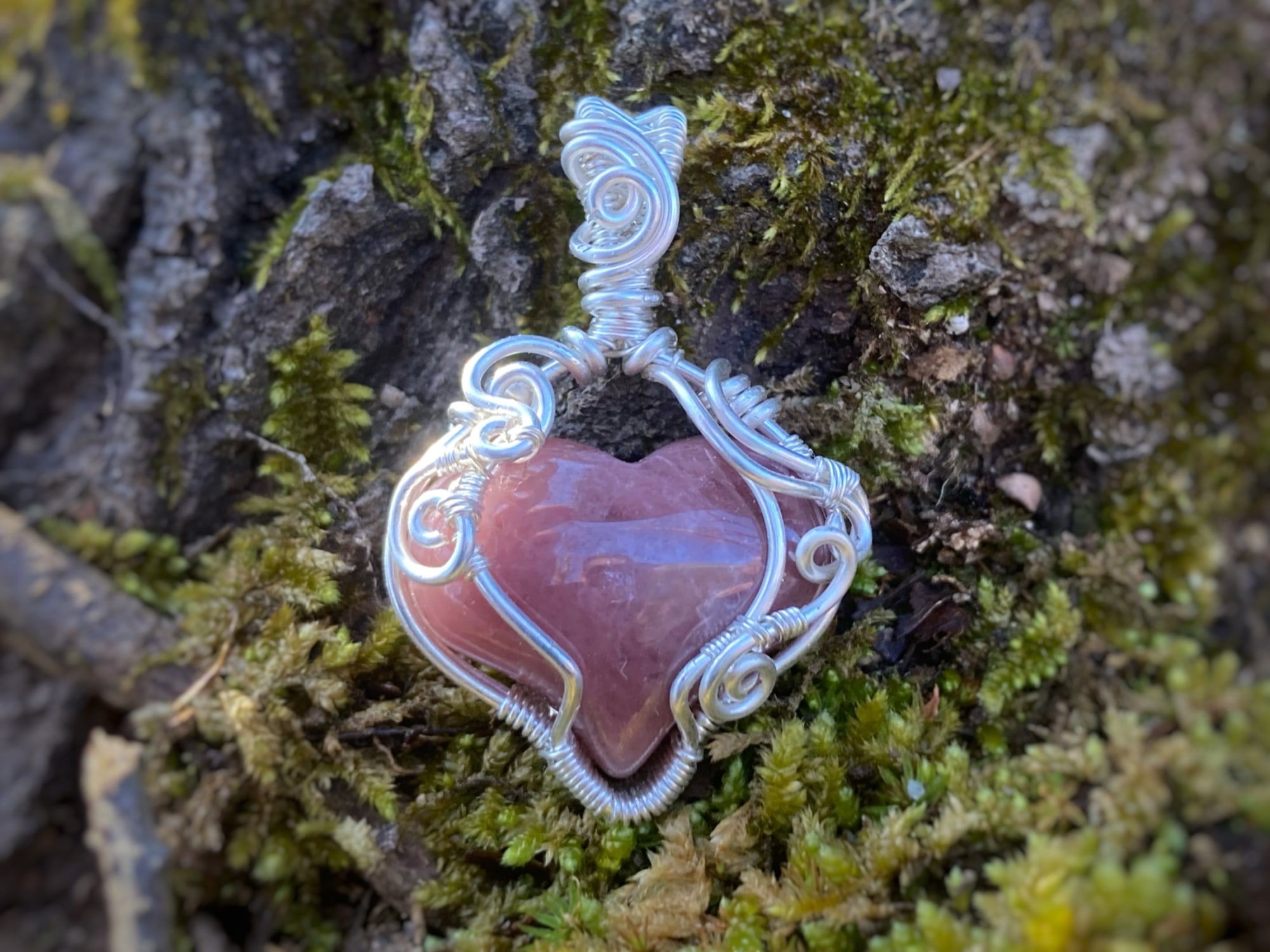 Strawberry Quartz Heart (may be dyed) wrapped in silver-filled wire.