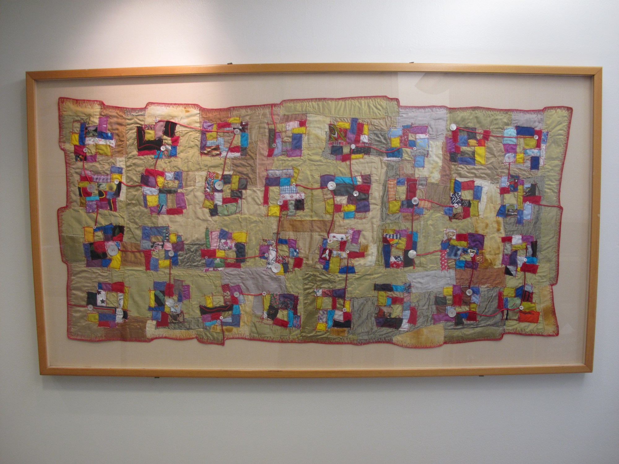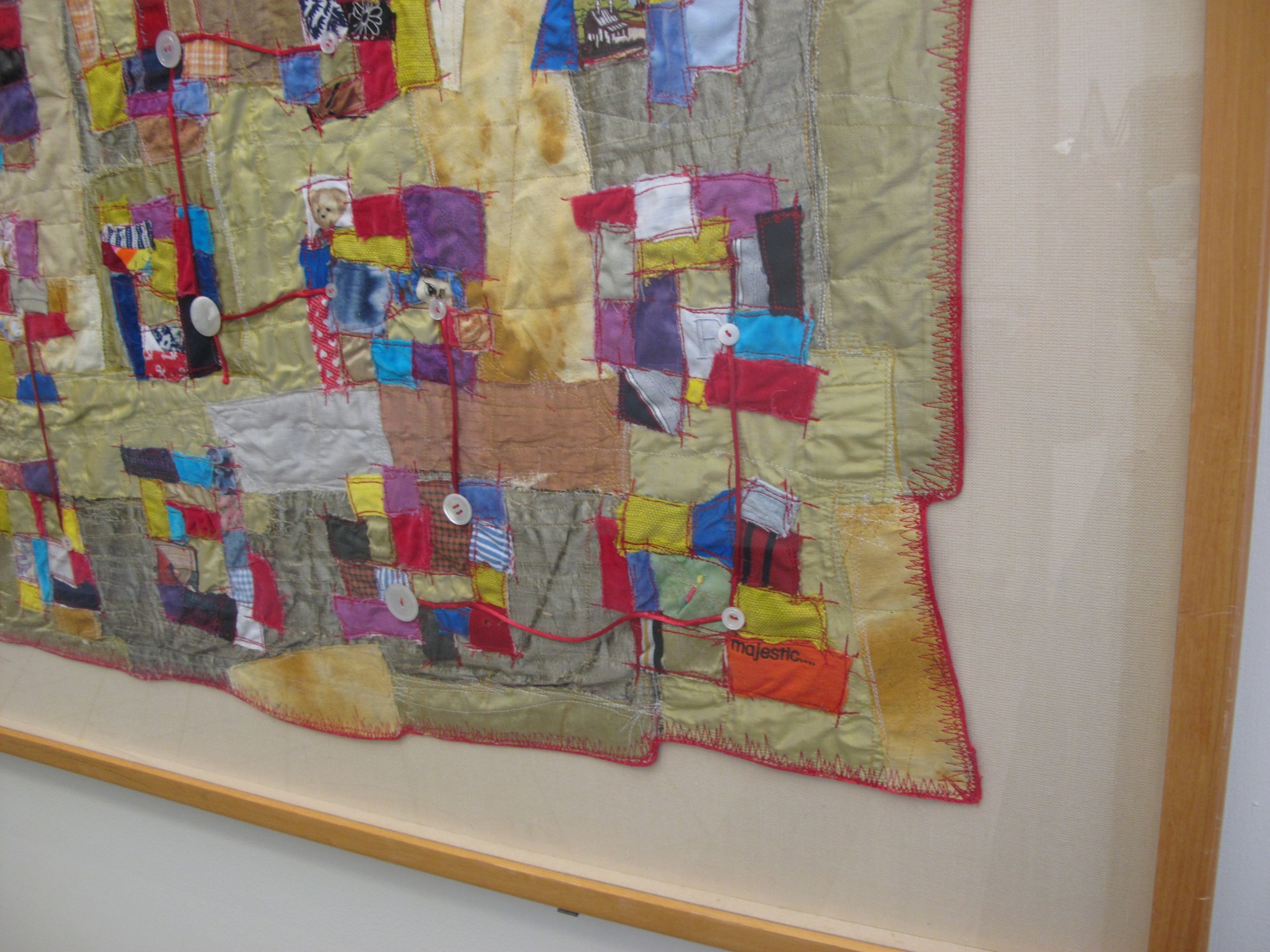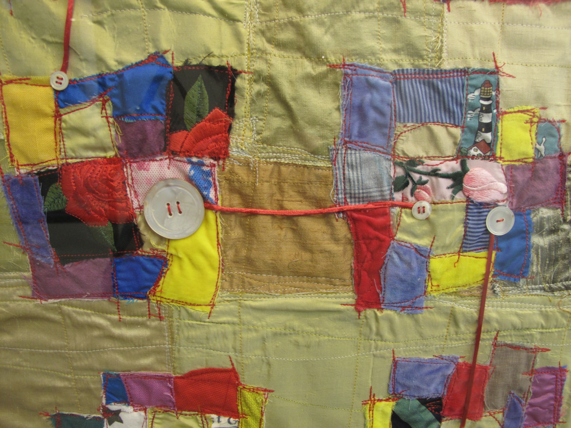 This quilt was created with fabric gathered at the Duke Hospital Services of Remembrance, on October 19, 2002, and April 12, 2003.