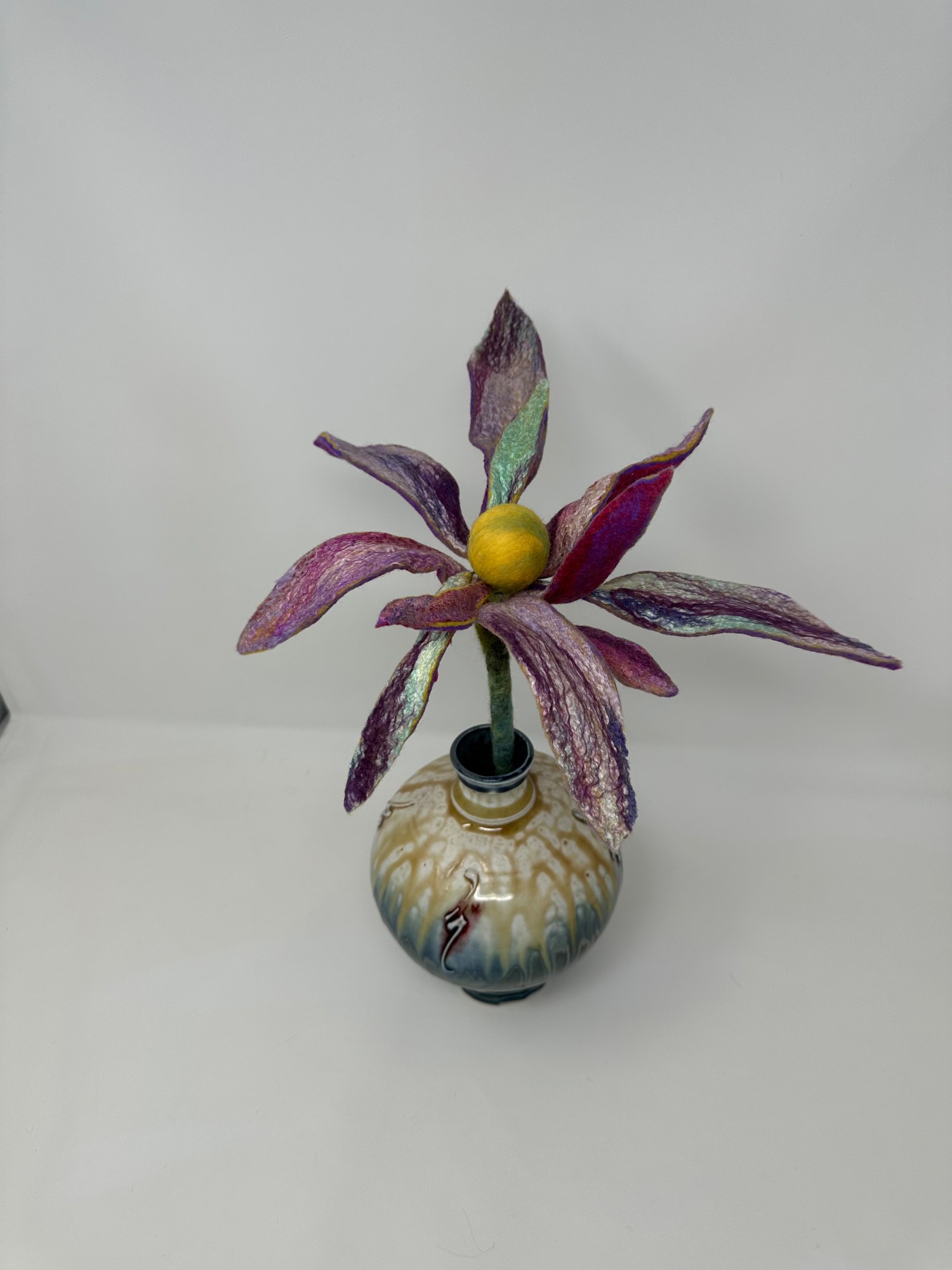 This flower will not ever wilt! Each individual petal was wet felted before assembling. This arduous process is reflected in the beautiful result. Hand thrown ceramic vase compliments this beauty