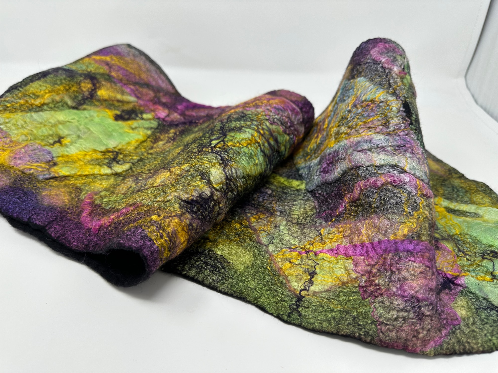 - Nuno felted with antique lace, hand spun yarn, viscose and Margilan hand dyed silk