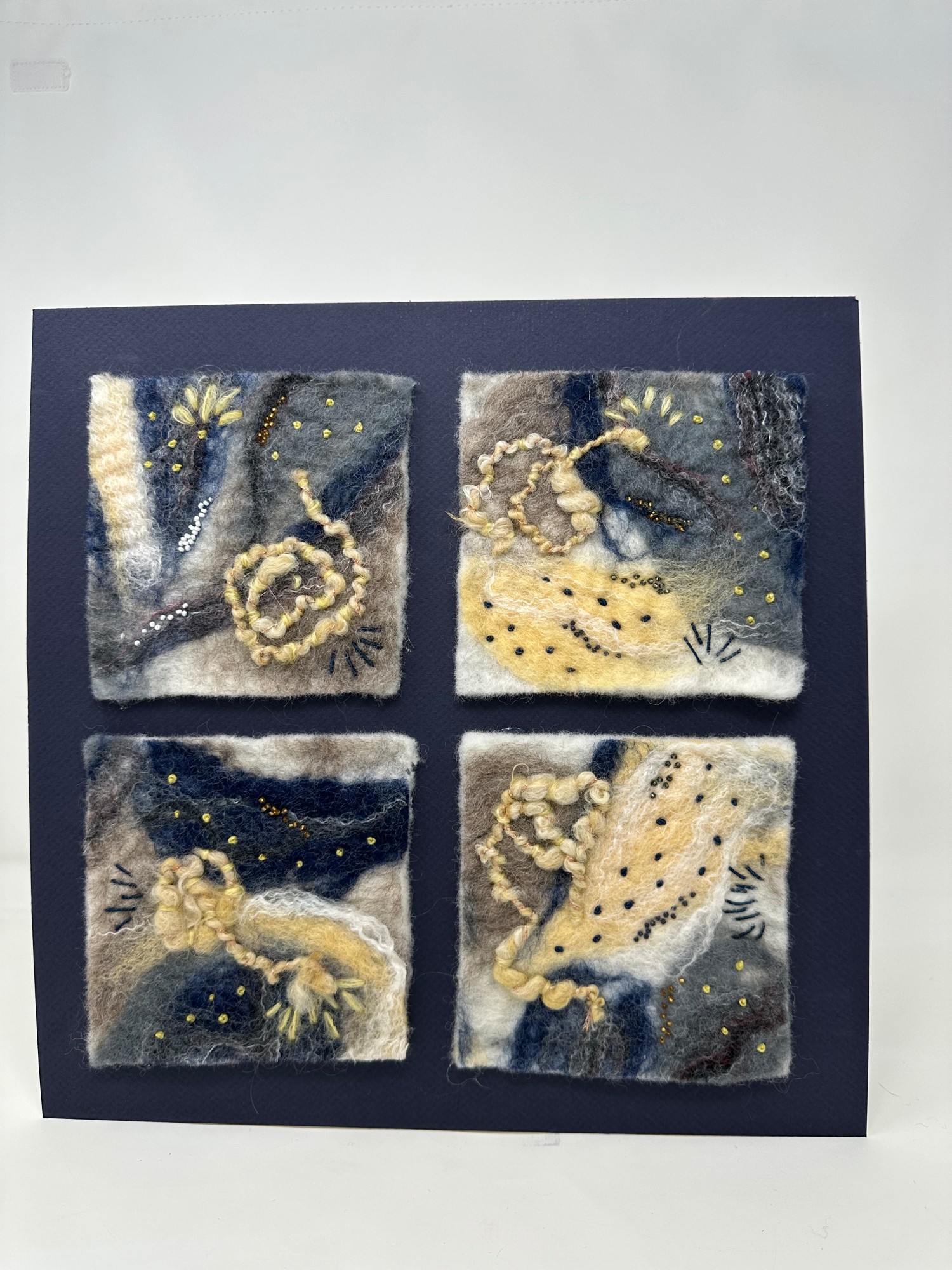 This has hand spun yarn, decorative stitches and beads. It is mounted on mat board and ready to frame