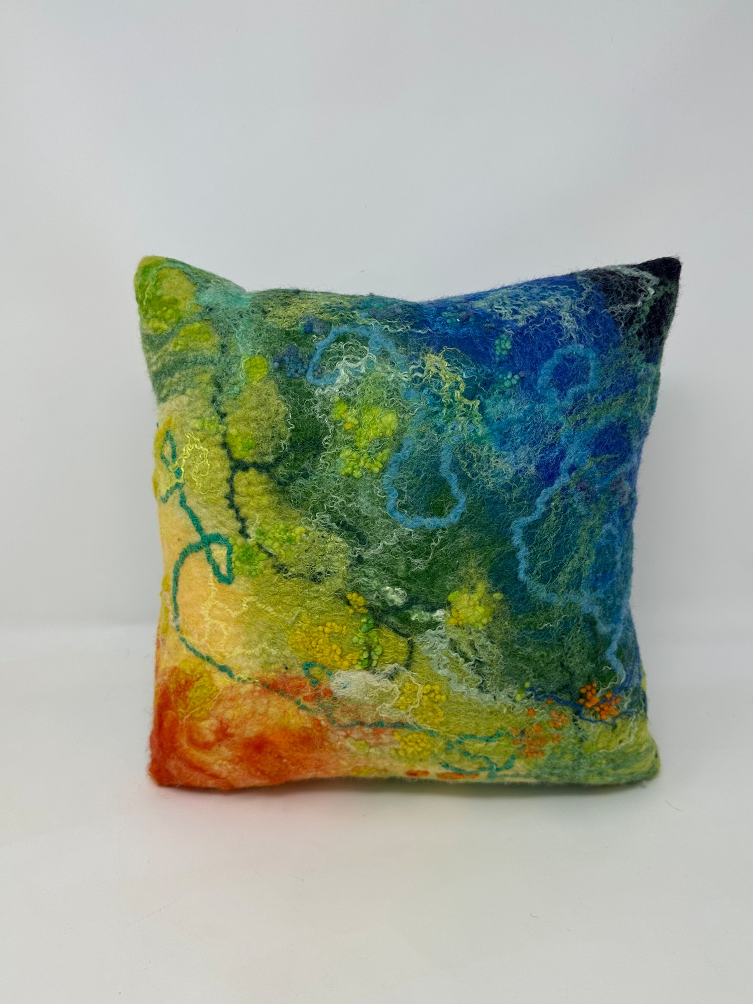 This zippered wet felted pillow has a cotton back. Insert can be removed to clean if necessary