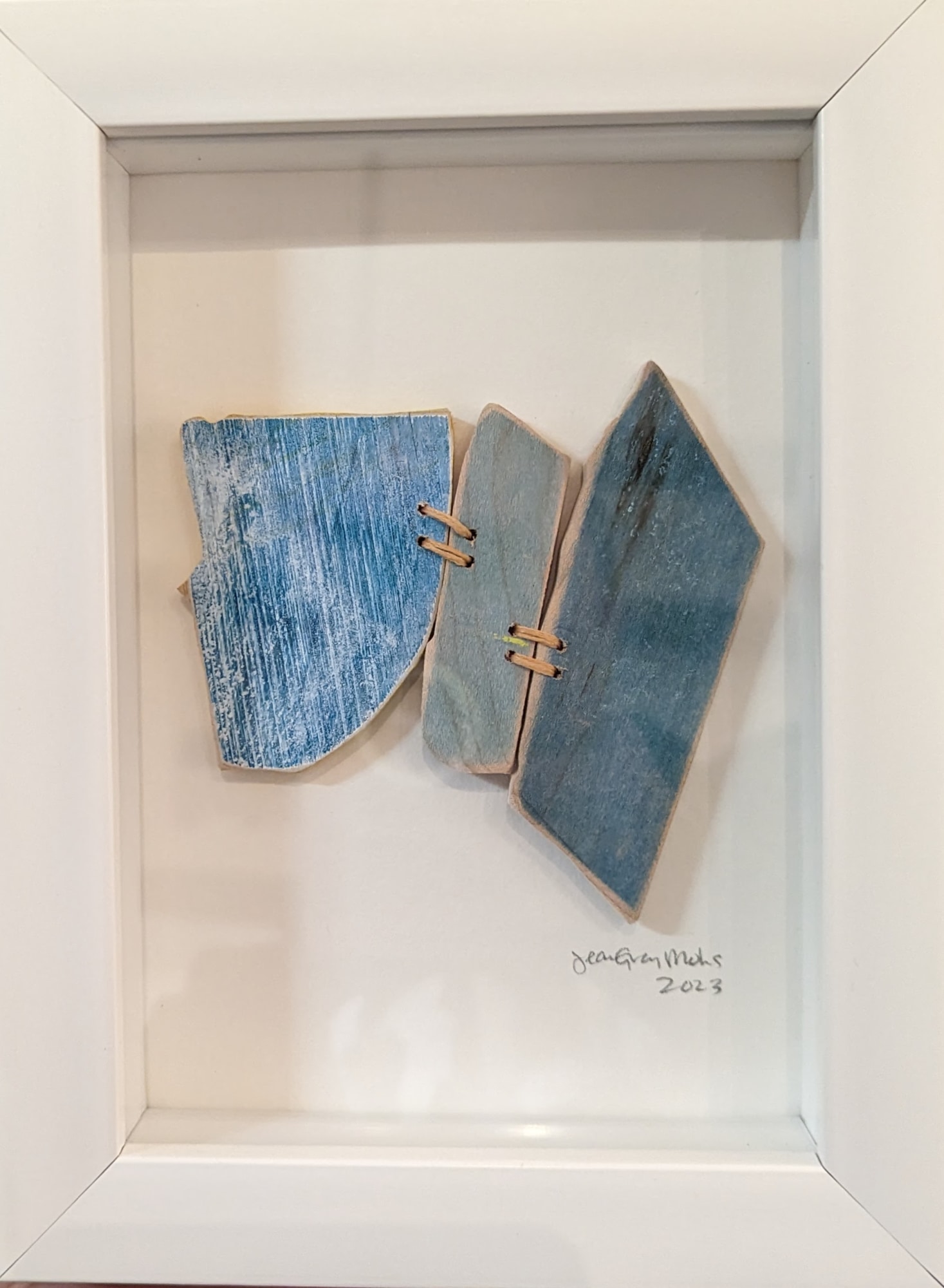 This piece is from a series called Woven Strangers which is a direct reflection of a double lung transplant that I received at Duke Hospital in 2019. Each piece reimagines a successful pairing. It is an original piece in a white frame.