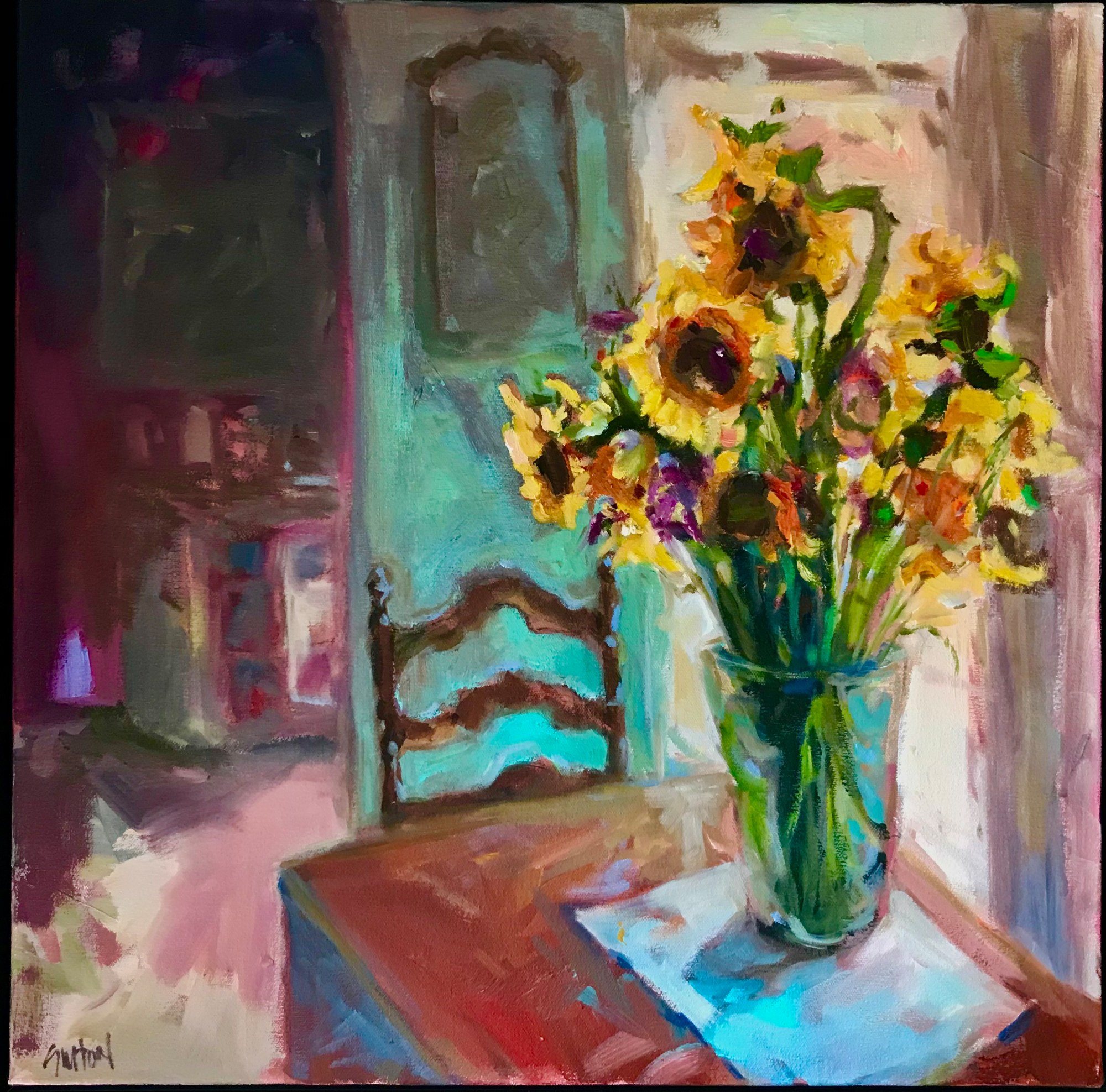 This is a painting of the interior of a room with a still life of sunflowers sitting in the window.