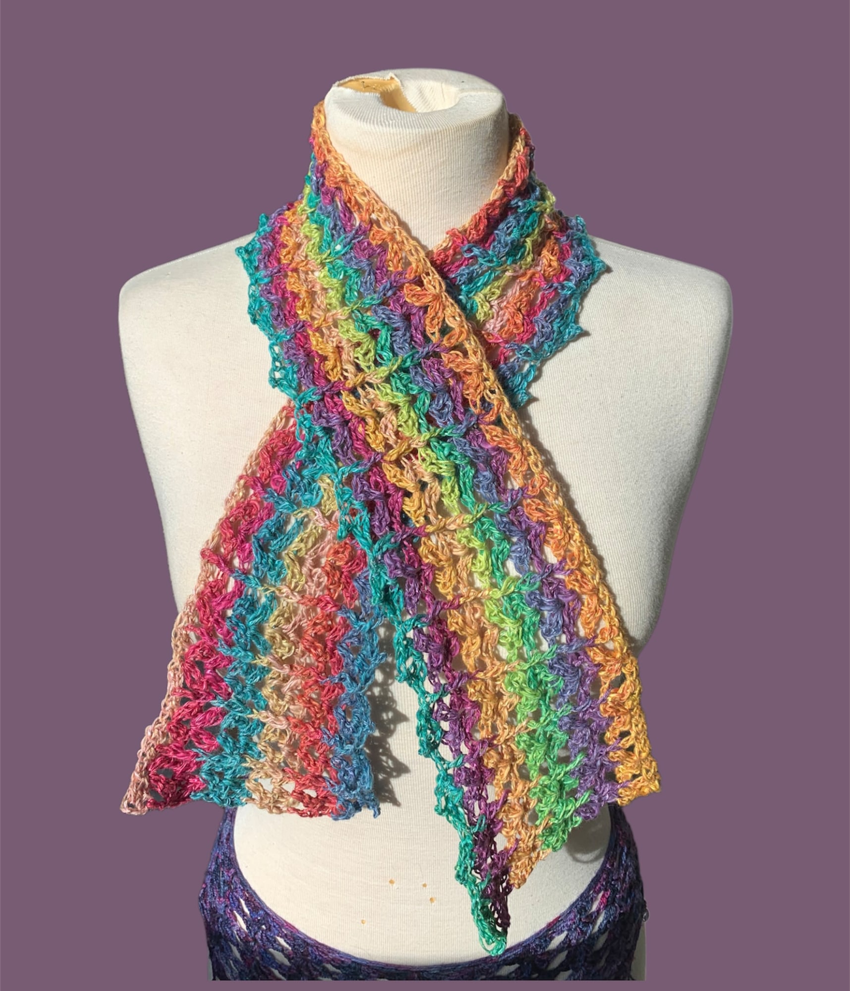 This crochet scarf is made of a blend of viscose, linen, and cotton, making it airy and lightweight. It is crocheted using shell stitches that create the spacey texture. The variety of colors shift gradually, making the opposite sides of the scarf look completely different when folded. Wear it around your neck as an accessory, unique necklace, or even tie it around your waist to add shape to your summer dress.