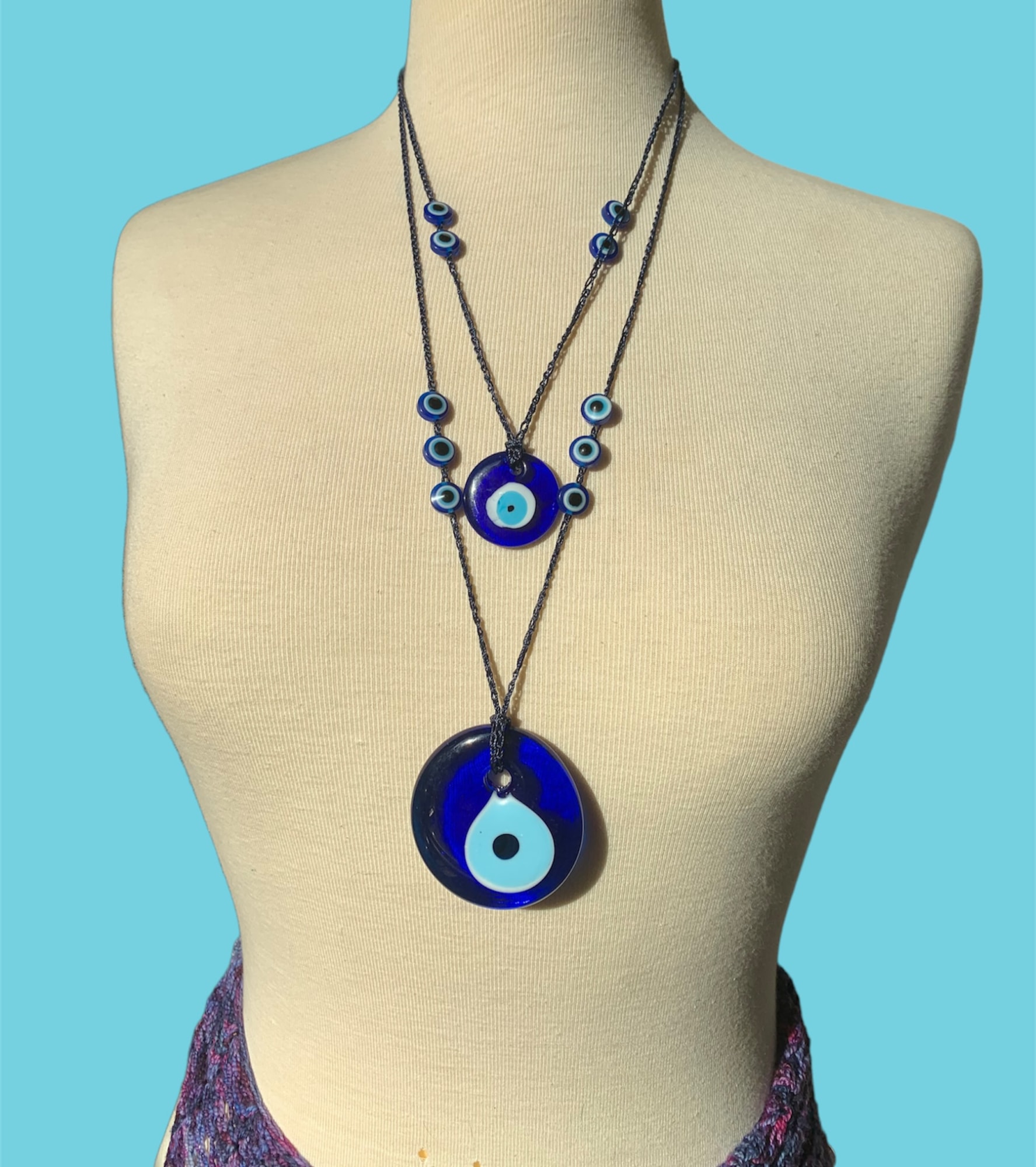 Turkish glass evil eye pendants strung on a crochet chain using nylon cord and a 2.1mm hook. Evil eye beads decorate the crochet chains. These necklaces are intended to be layered together.
