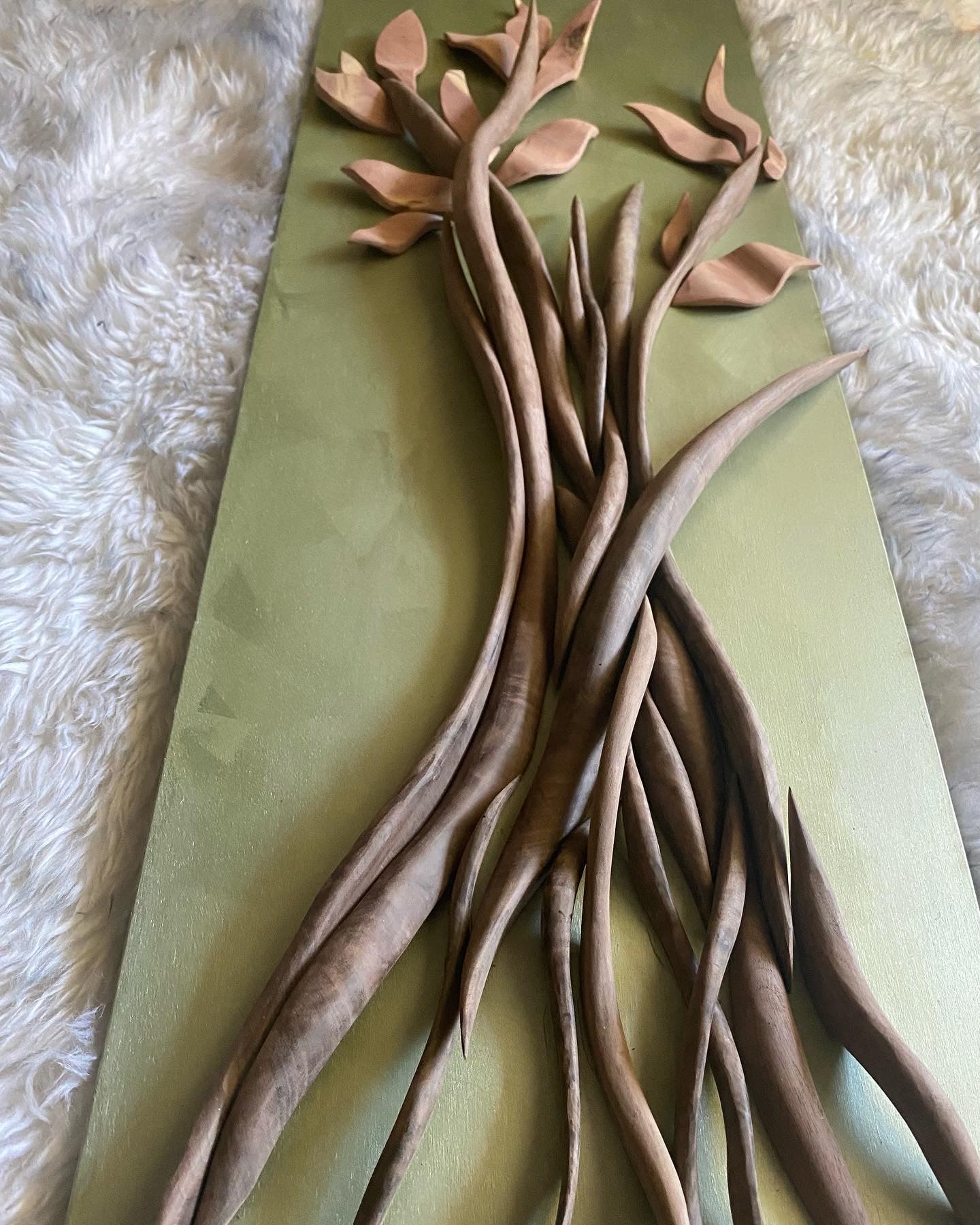 Wood stems intertwine and interweave in this hand carved and cut wood sculpture.