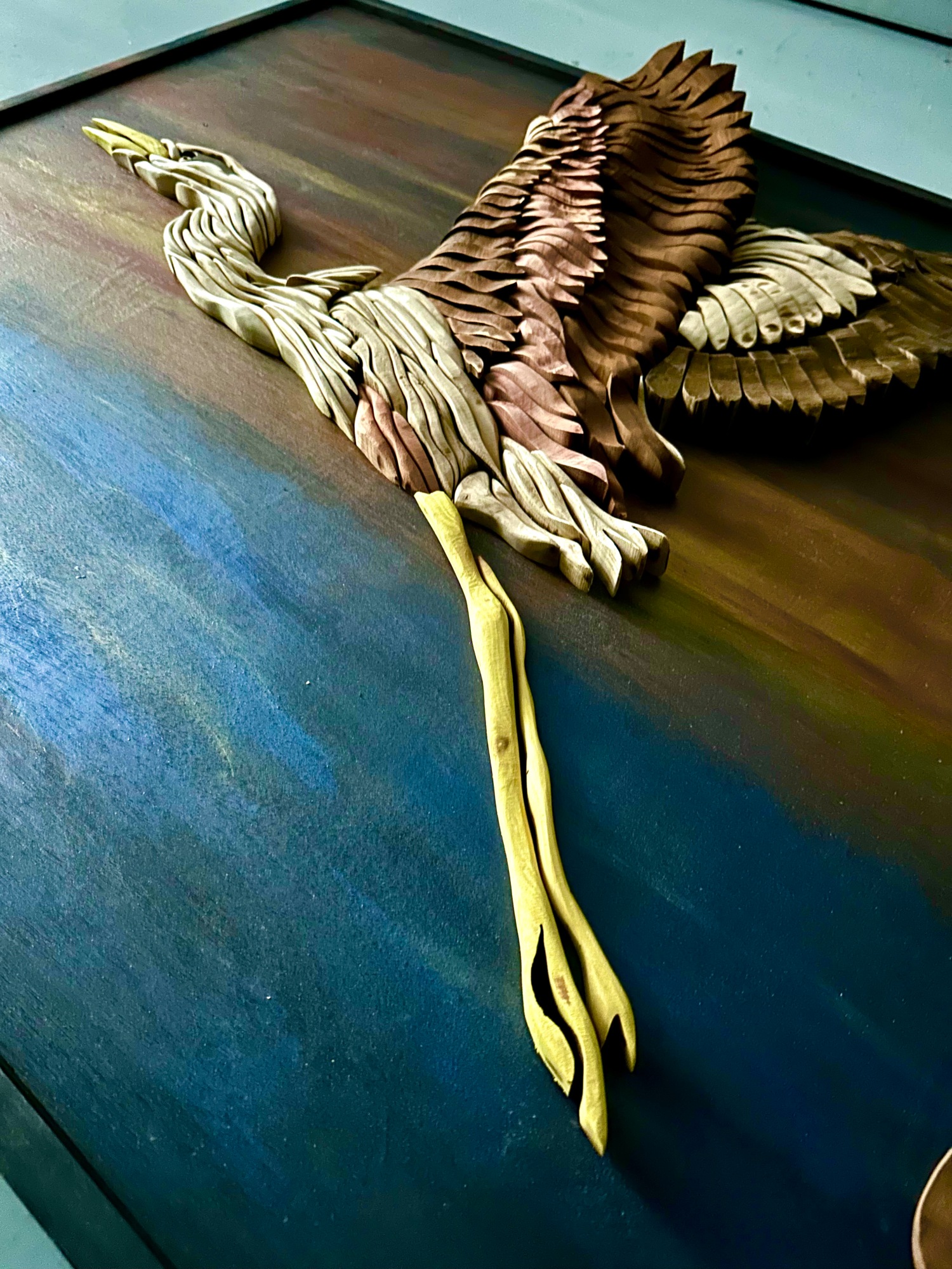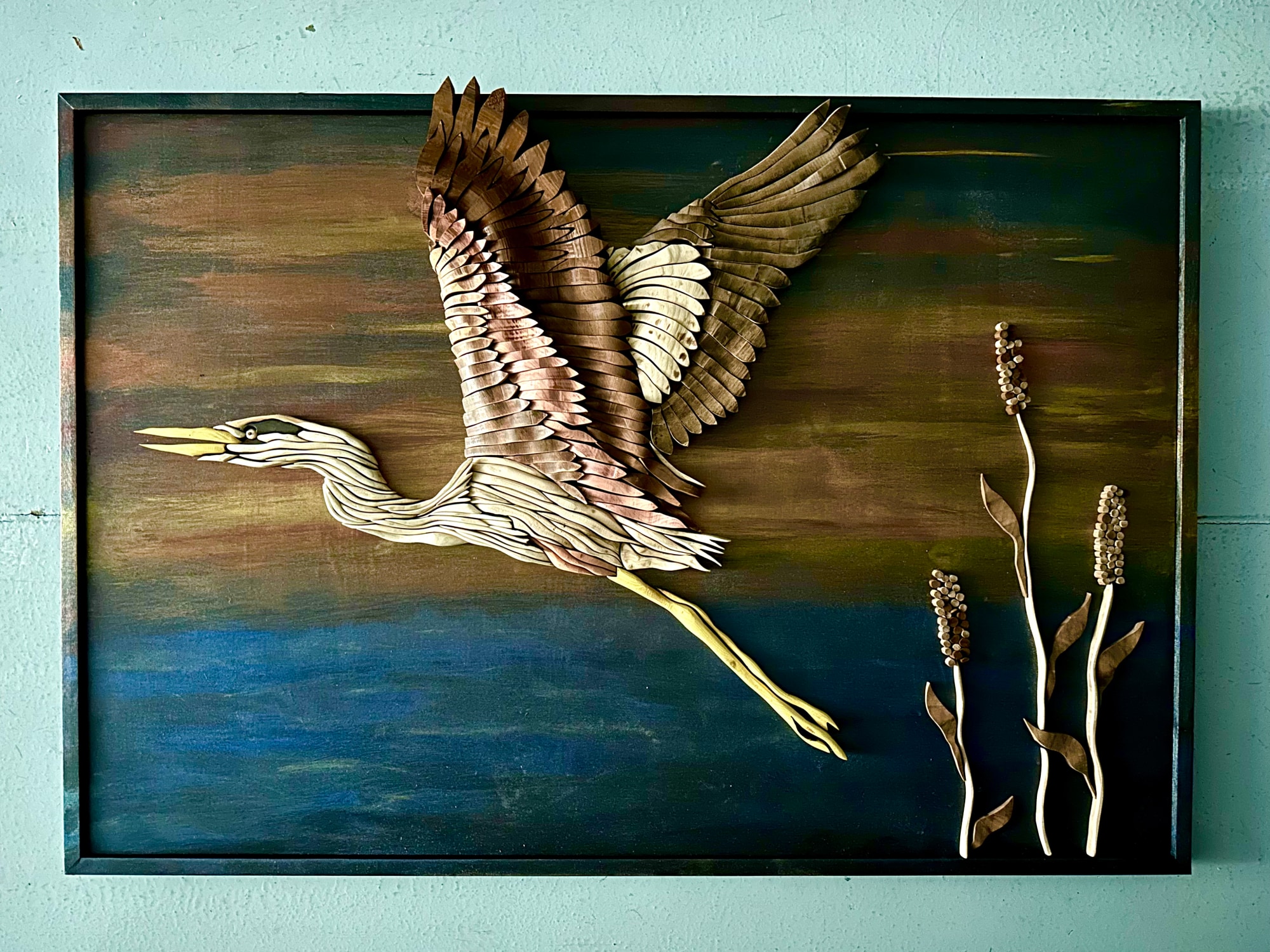 Carved and cut cedar, walnut, mahogany, and maple on painted wood panel. Craftsman frame.