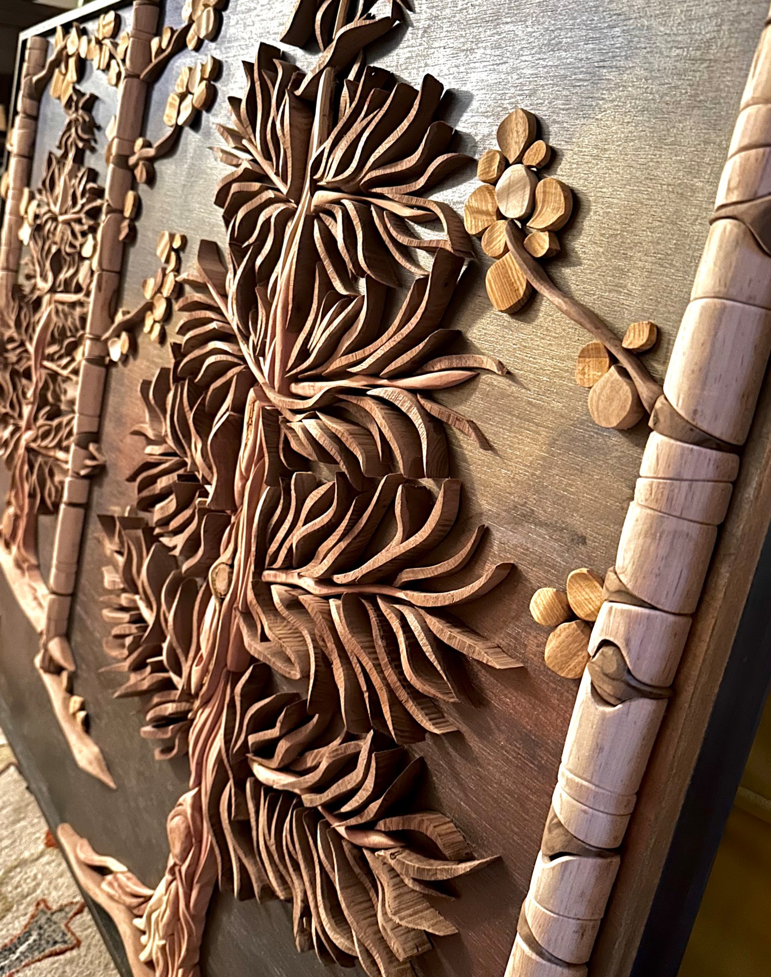 Carved and cut from NC maple, walnut, cedar and canary wood.