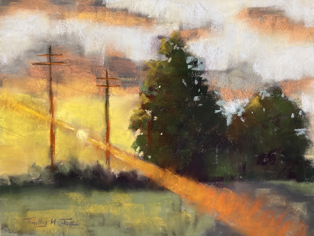 This painting was created along the roadside of the artist’s familial property and represents another anchor point in his artistic development. His love for manmade structures in nature and the fleeting light are what make this piece unique.