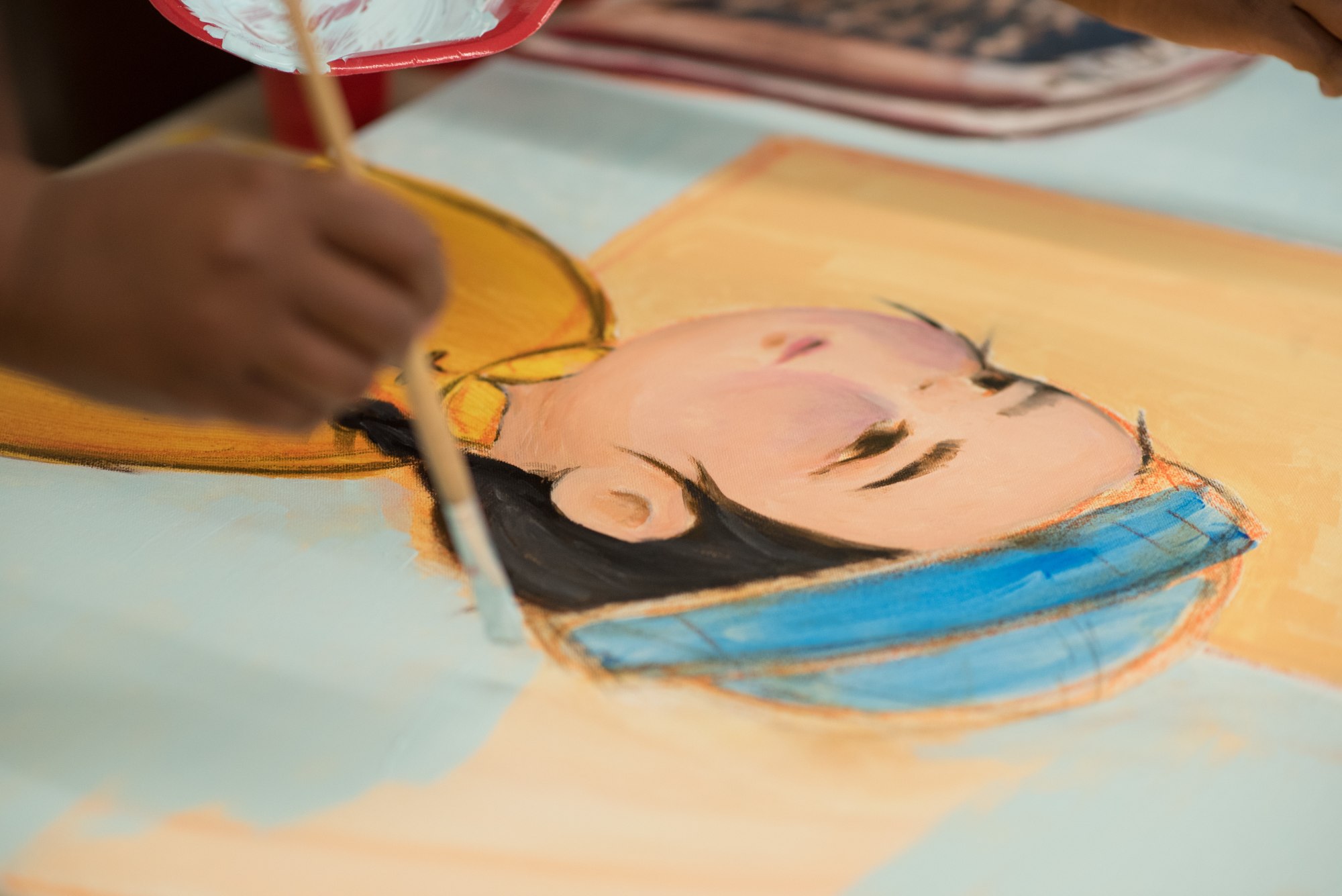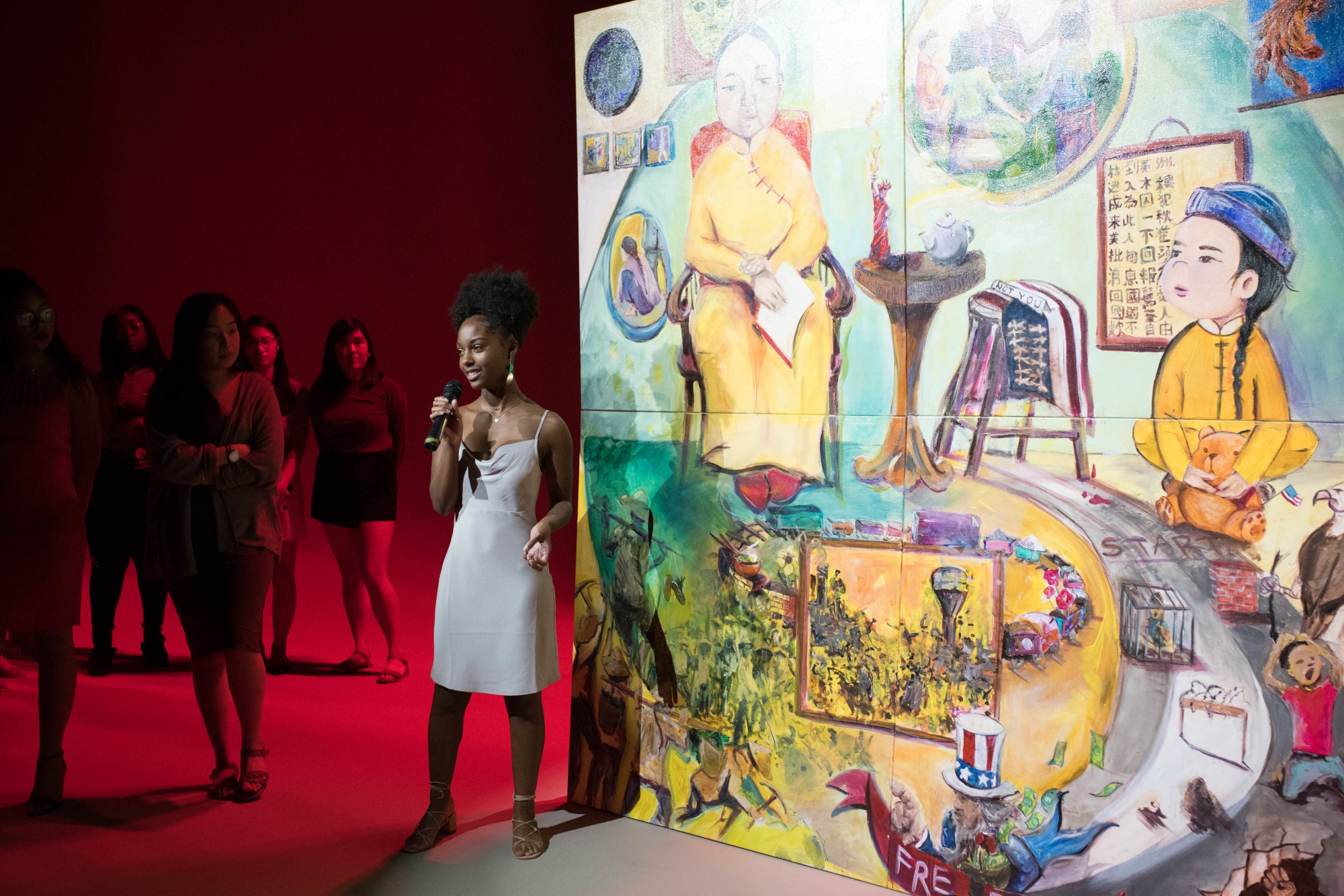 The resulting 8’ x 8’ traveling canvas mural depicts scenes from the country’s troubling history of exclusion and discrimination, while making parallels to contemporary struggles around immigration and racial justice. The artwork also pays homage to the Chinese influence on local cuisine by showing a bowl of Ya-Ka-Mein, a New Orleans dish influenced by Chinese immigrants who resided near Tulane and Loyola and later the French Quarter from the 1880s to the 1970s. Through the project, conversations around belonging and inclusion guided the artists to include an image of hope in the mural: a phoenix carries an olive branch signifying our vision for our country to be reborn as a nation that values peace and inclusion for all people.