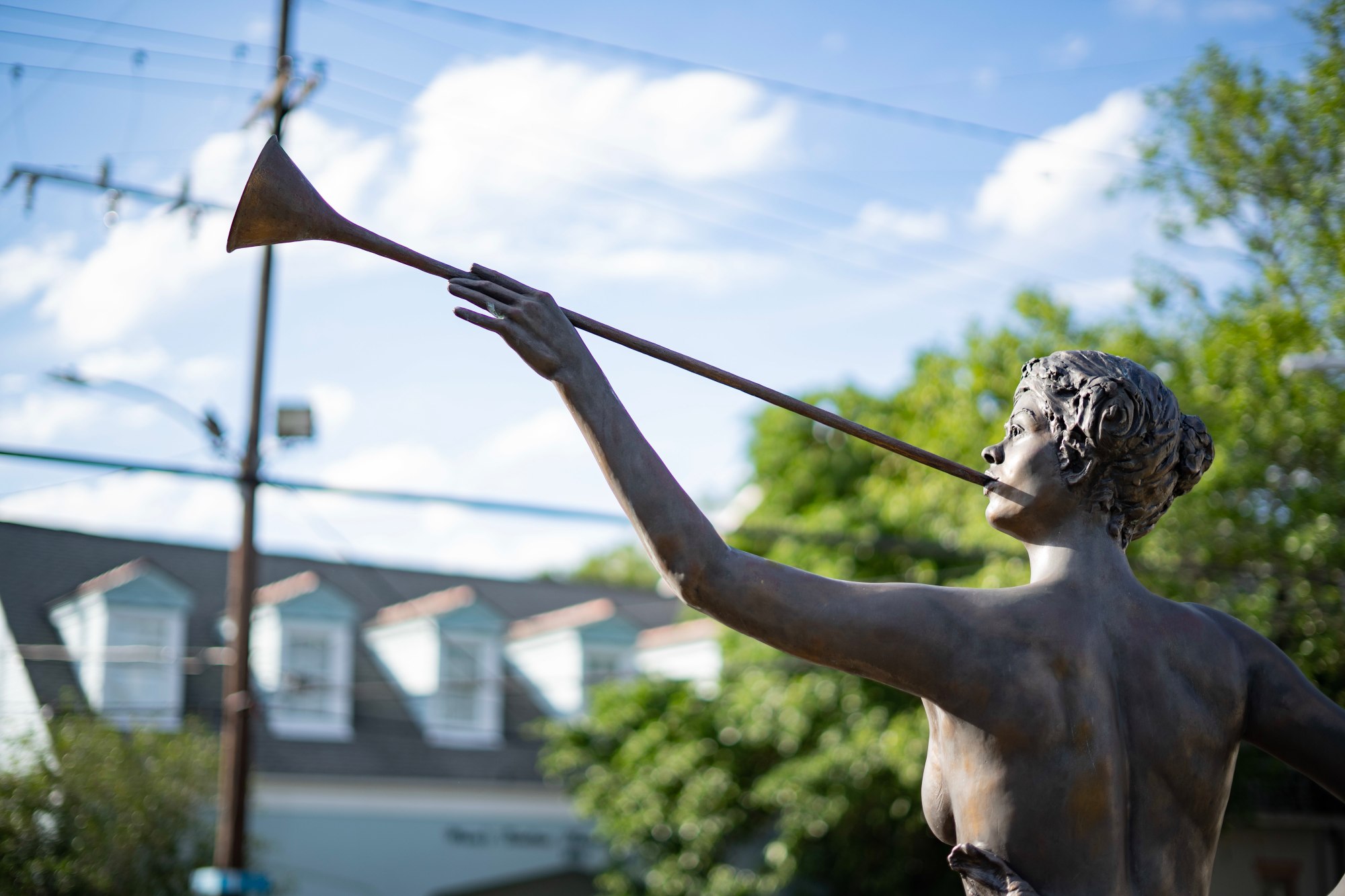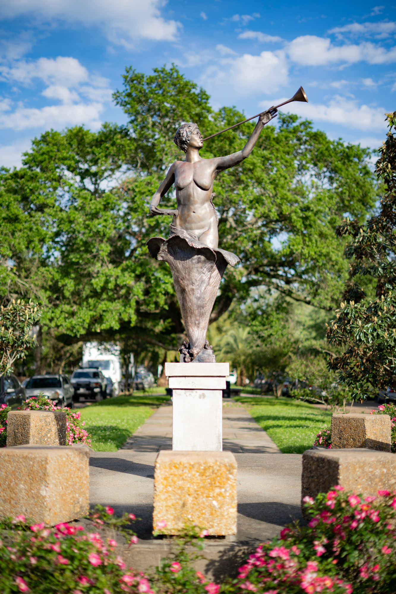 "Birth of a Muse" is a cast bronze figure representing Terpsichore, one of the nine muses who are the namesakes of the Lower Garden District neighborhood. Bernadas explains: