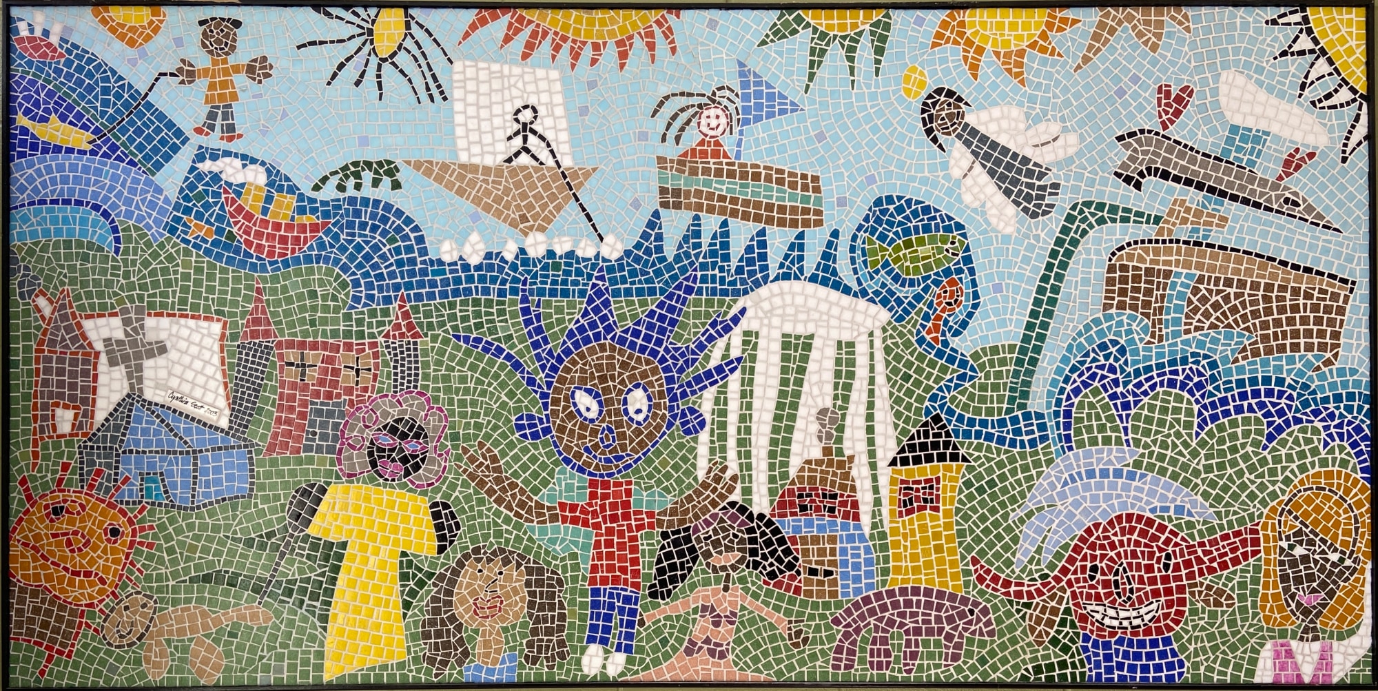Ms. Scott worked closely with students of Rosenwald Elementary School to create drawings of their community. The children responded with pictures of themselves, their homes and churches, and familiar landmarks like the river and water tower. To design the mosaic, Ms. Scott used pieces from all of the drawings and collages gathered in the workshops as a source for one composite image. She then used that drawing as a model for the tile mosaic, "Chillin’ in the Cut-Off."