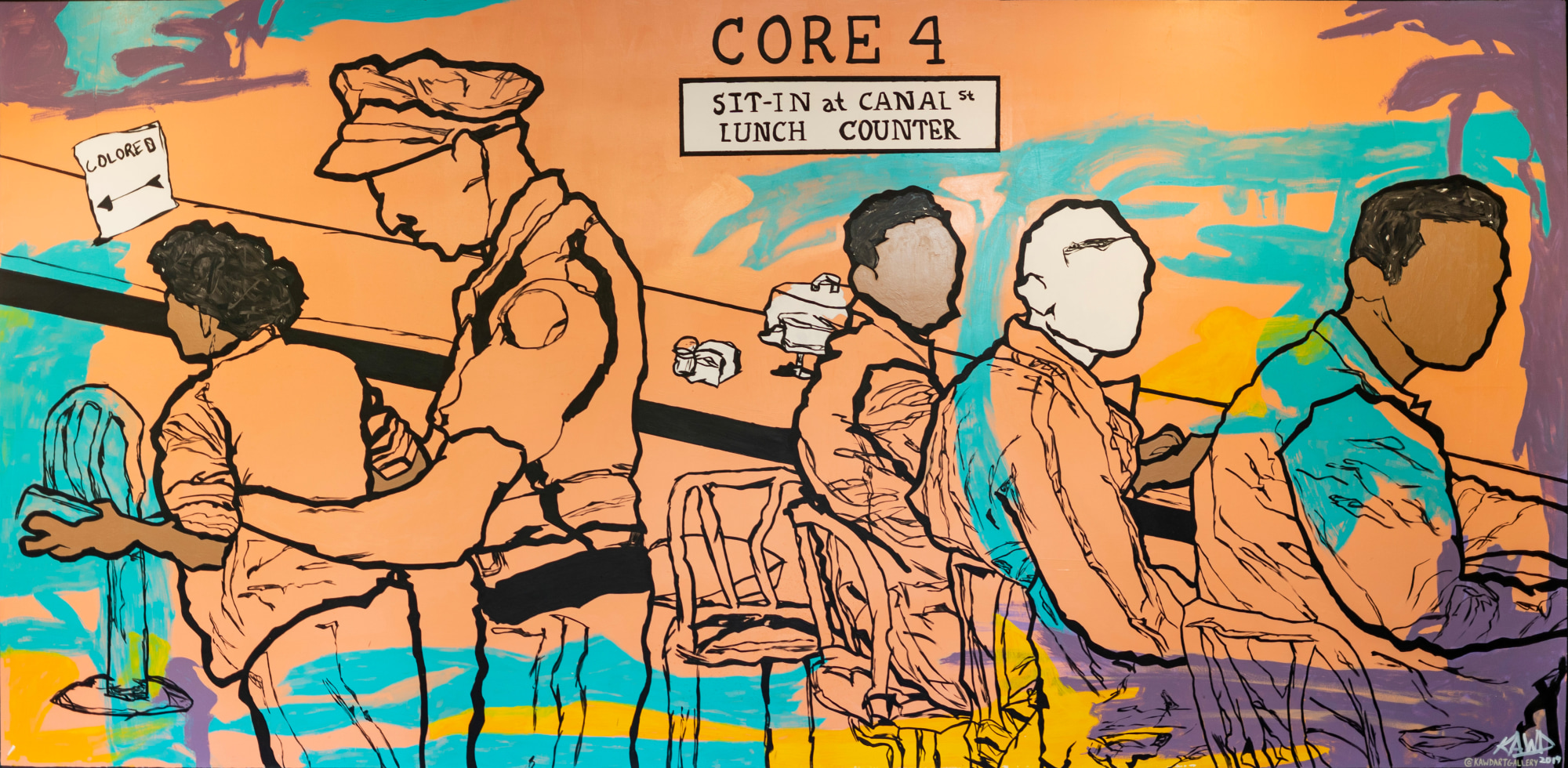 The café mural led by Kristen Downing commemorates the high-profile lunch counter sit-ins led by the New Orleans chapter of the Congress of Racial Equality (CORE) to protest racial segregation. The mural depicts the arrest of Oretha Castle Haley and three fellow CORE civil rights activists – Cecil Carter, Sydney Goldfinch and Rudy Lombard – at the McCrory’s lunch counter sit-in on September 17, 1960, a historic moment that took place just across the street from where the hostel now stands on Canal St. The artists chose to intentionally leave the faces in the mural without expression, allowing the viewer to imagine themselves in that person’s place.