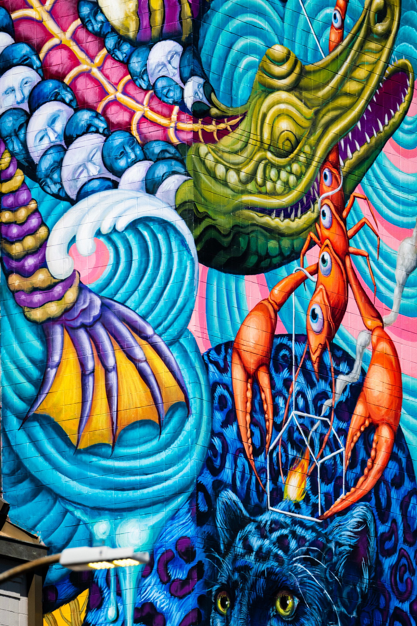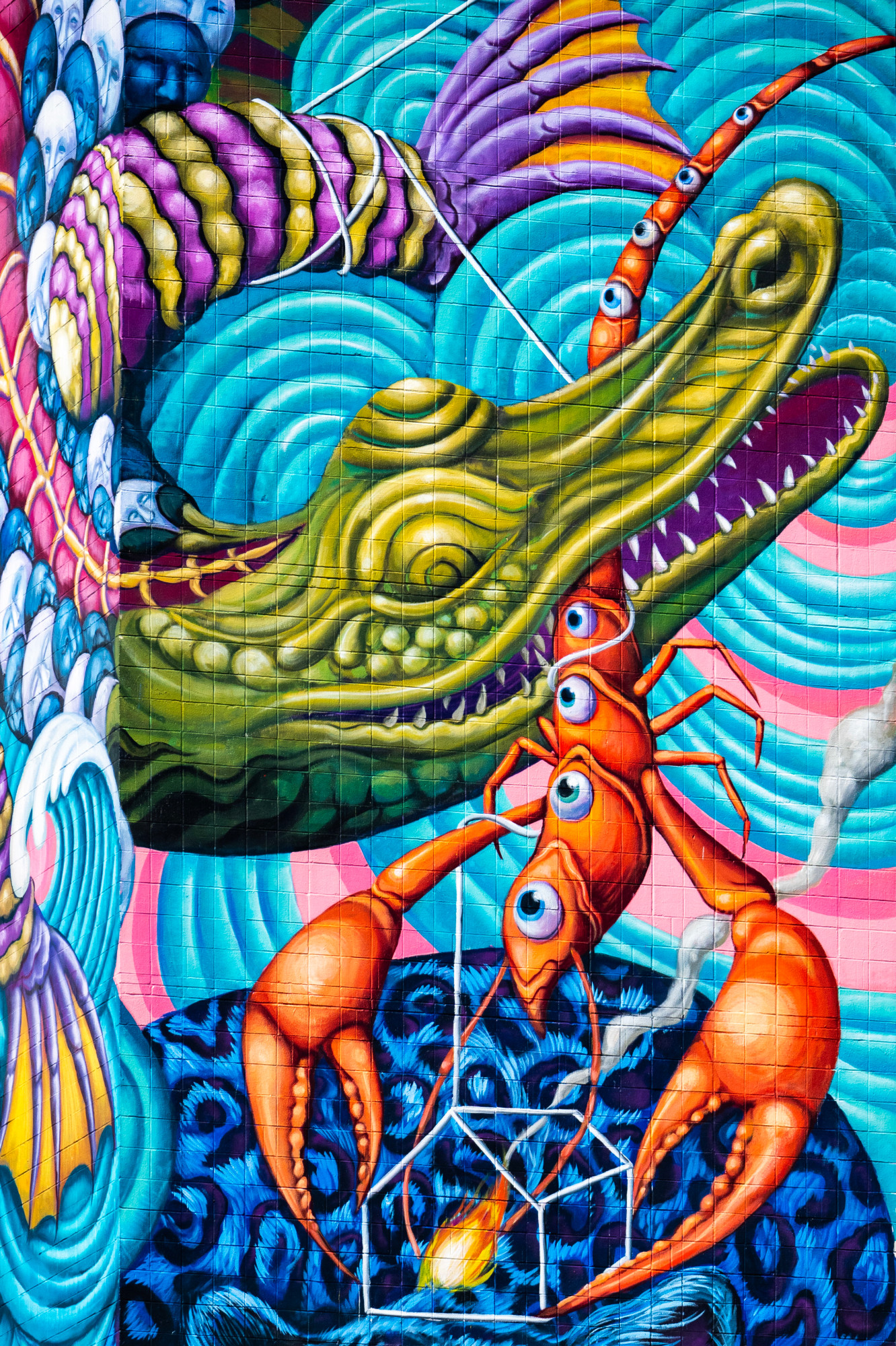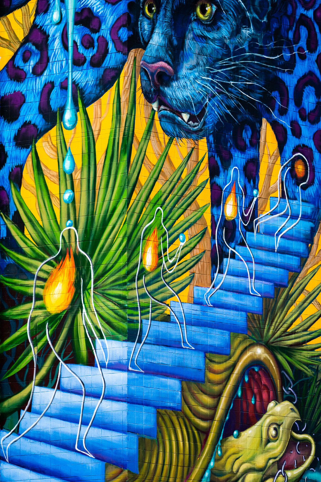 Ignite is an homage to the rich history and culture of the BIPOC communities that have created the city. Danaé Brissonnet highlights the interconnectedness of resistance, resilience, and creative power of community in light of both the historical oppression and the natural world. Using elements of the natural environment, like the surrounding swamps and unique wildlife, Brissonnet’s mural looks to touch the collective unconscious, using her wildly graphic and colorful style, bringing a narrative of the beauty of New Orleans to life.