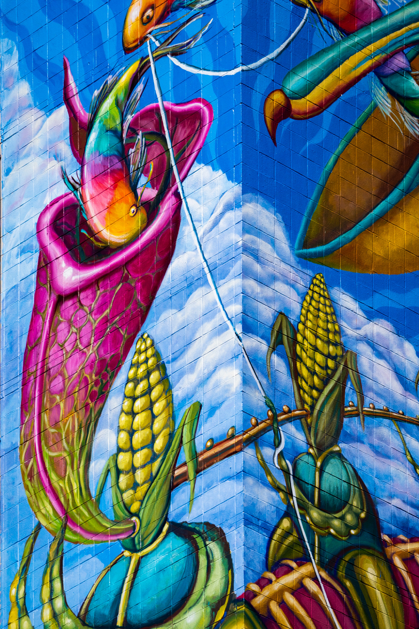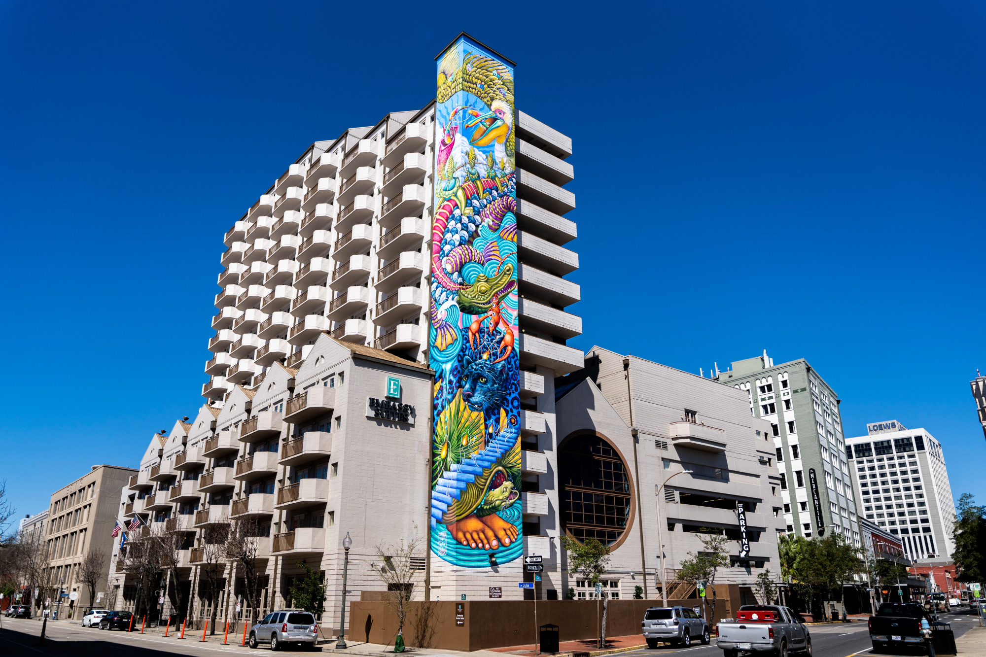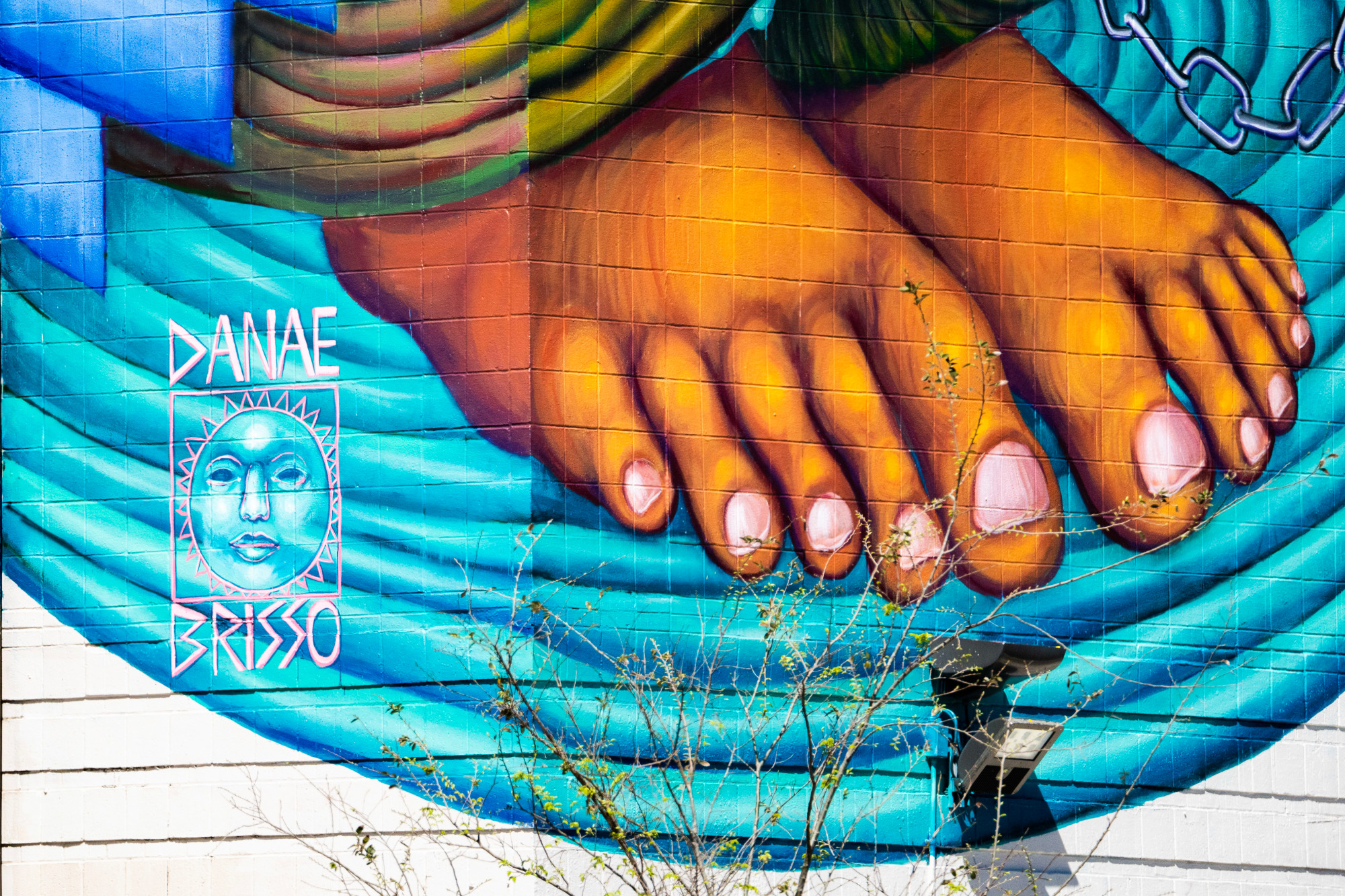 Ignite is an homage to the rich history and culture of the BIPOC communities that have created the city. Danaé Brissonnet highlights the interconnectedness of resistance, resilience, and creative power of community in light of both the historical oppression and the natural world. Using elements of the natural environment, like the surrounding swamps and unique wildlife, Brissonnet’s mural looks to touch the collective unconscious, using her wildly graphic and colorful style, bringing a narrative of the beauty of New Orleans to life.