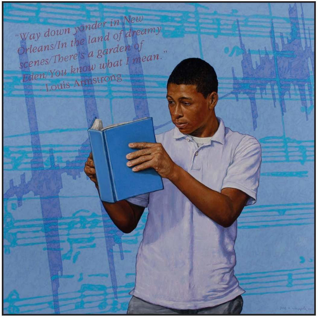These 11 paintings by Jeff Whipple were commissioned for a new library in New Orleans. The newly constructed library replaced one that was destroyed by the flooding when the levies broke after Hurricane Katrina. His idea was to use people from the library's community as models for paintings depicting the appreciation of reading. Whipple went to New Orleans and photographed dozens of library patrons who posed with books. He selected sixteen models for the eleven oil paintings that hang throughout the 30,000 square foot library. Whipple was determined to make the paintings look like the models because library visitors will know and recognize them. He believes the portraits will provide a sense of community in an area that was severely damaged by the tragic flooding.