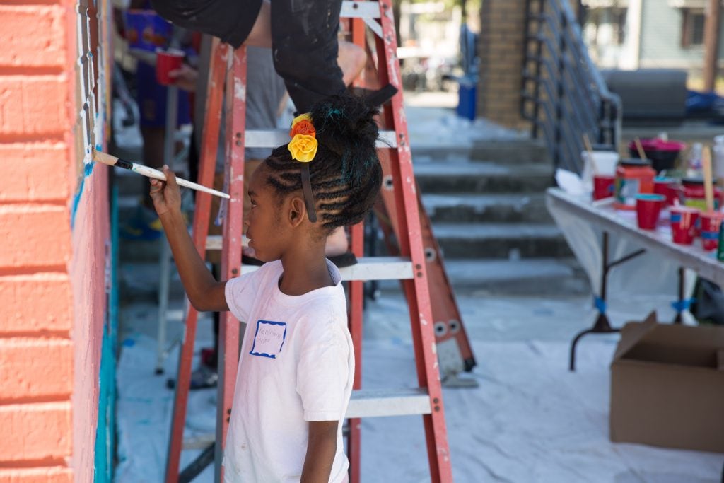 The mural is a product of a six-week dialogue series addressing structural racism with 23 intergenerational community members, led by Center for Restorative Approaches and Equity in All Places. Over 150 youth and community members contributed to the mural through an extensive community engagement process that included a community design workshop, a design presentation, a community paint day, and an unveiling and block party.