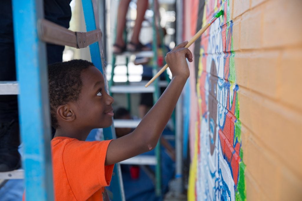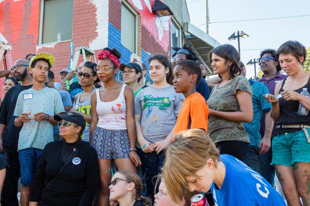 The mural is a product of a six-week dialogue series addressing structural racism with 23 intergenerational community members, led by Center for Restorative Approaches and Equity in All Places. Over 150 youth and community members contributed to the mural through an extensive community engagement process that included a community design workshop, a design presentation, a community paint day, and an unveiling and block party.