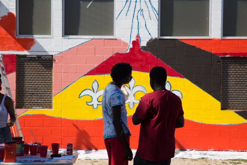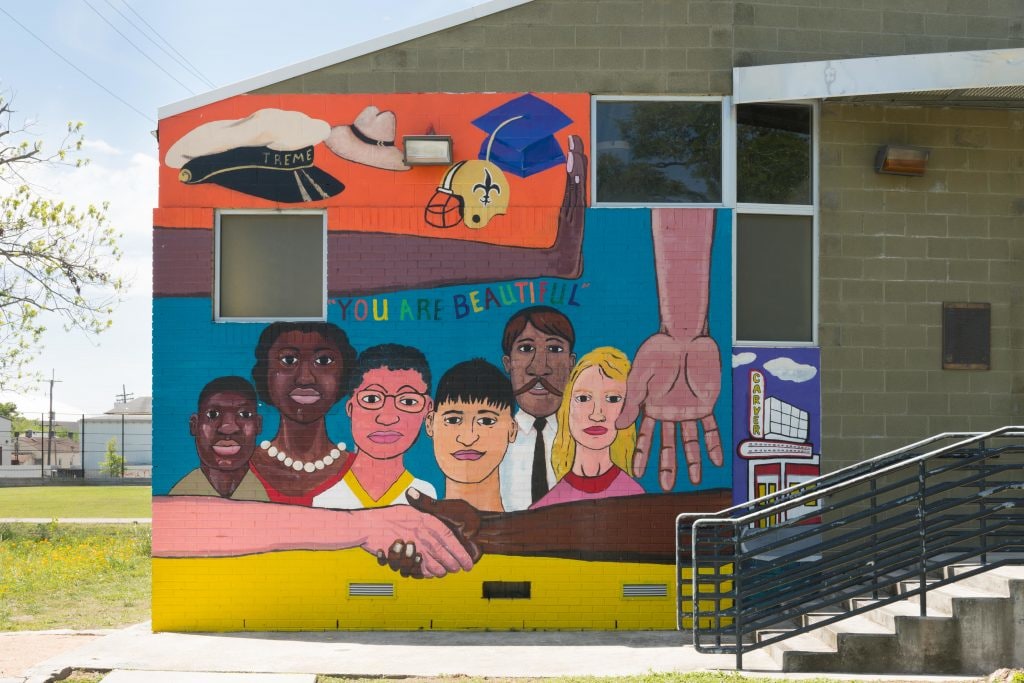 “Lafitte, Treme: Between the City and Me” is a community mural designed by YAM youth artists under the guidance of lead artist mentor and local talent Keith Duncan. The project came out of the Welcome Table New Orleans, a citywide program to address racial reconciliation and healing, initiated by Mayor Mitch Landrieu in partnership with the Winter Institute of Mississippi.
