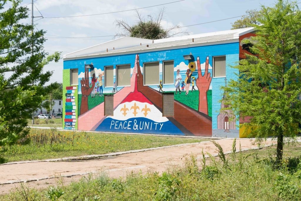 The mural wraps around five walls of a community pool near Lemann playground, a site that was once segregated by race. The mural depicts local culture and Lafitte neighborhood history to promote a message of harmony and unity. Through the program, the youth artists received professional training in research, design, painting, and financial literacy, as well as compensation for their hard work.
