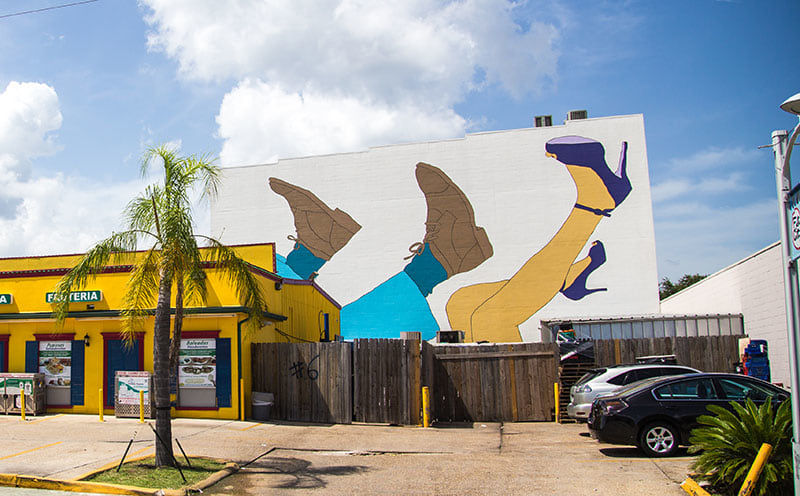 Kyle Bravo’s mural “Legs in the Air” features 2 pairs of legs – both dressed for a night out on the town. The mural pays homage to Fat City’s renown as a night-life destination. Bravo’s work is often site specific or installed in a manner that responds directly to the context in which it is seen. With a dark humor, Bravo’s work explores the intersection of the mundanity of everyday life alongside an ongoing existential search for meaning and purpose.