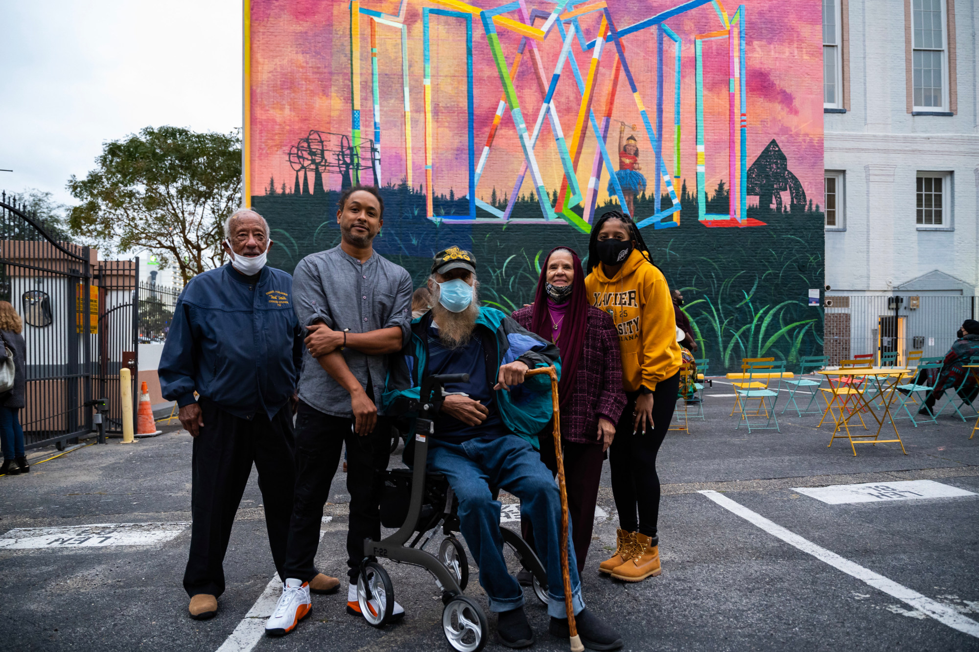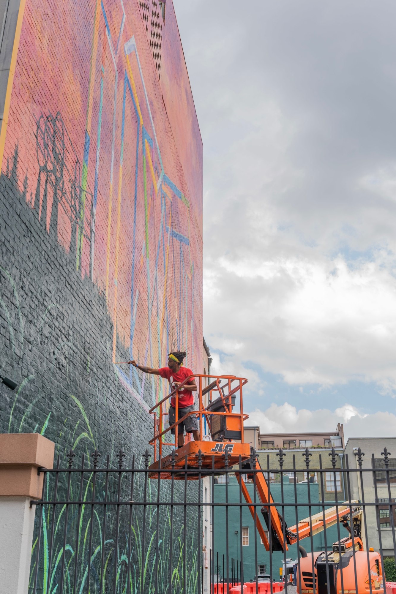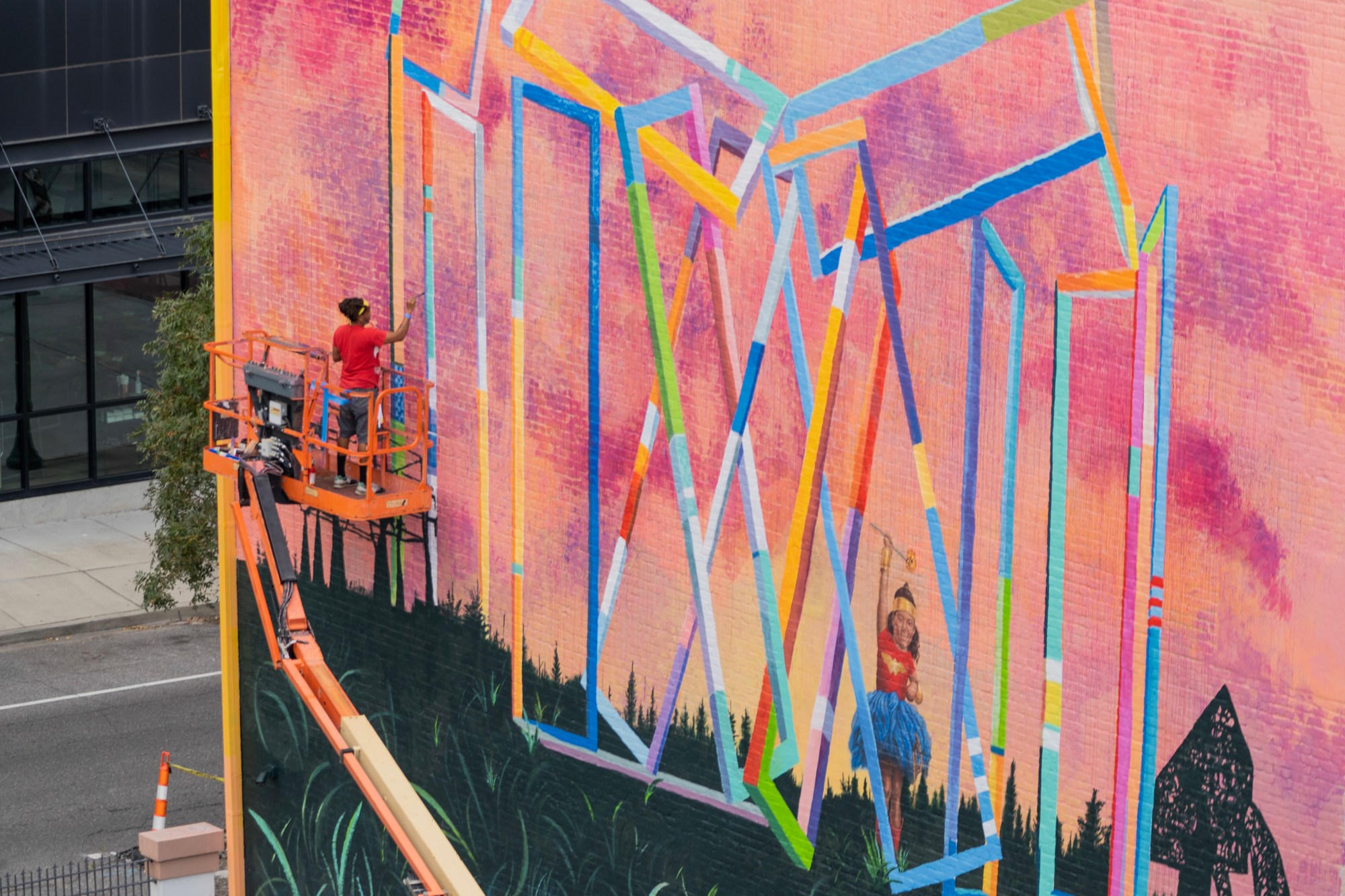 This mural is an ode to generations of New Orleanians, with depictions of artist Ayo Scott's father John Scott’s well-known public sculptures "Spirit House" and "Ocean Song," and his young daughter dressed as Wonder Woman holding a daisy as tribute to his mother.