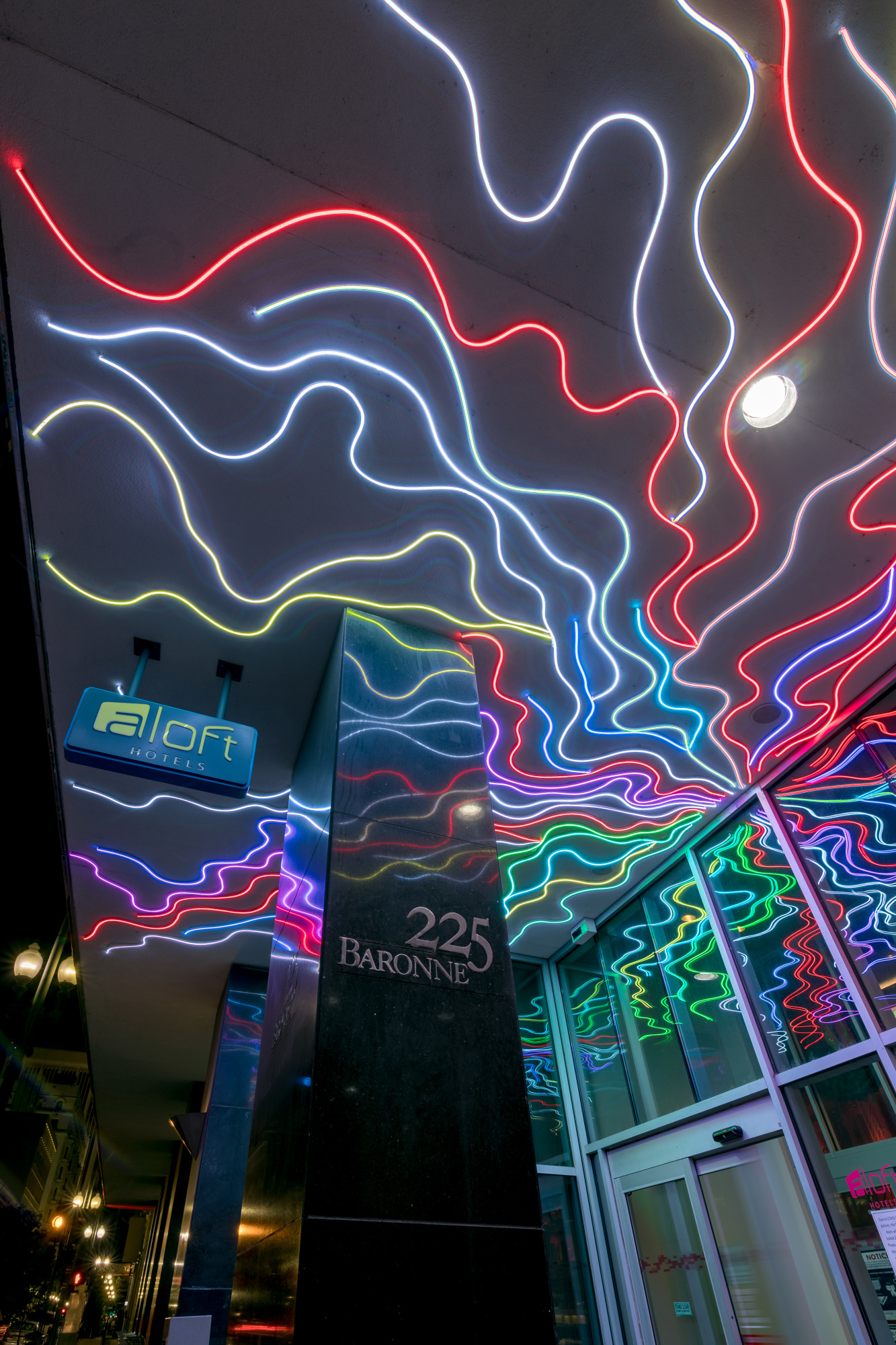 Inspired by LUNA Fête, Aloft commissioned Arts New Orleans to create an innovative, inspiring, and distinctive sense of arrival to surprise and delight guests. An interactive light-based art installation that is an inspiring and distinctive visual element to surprise and delights guests on arrival to the Aloft New Orleans Downtown. Inspired by the Mississippi River tributaries and surrounding wetlands, the interactive components are meant to be a playful illustration of the impact we make as individuals on the environment.