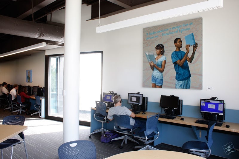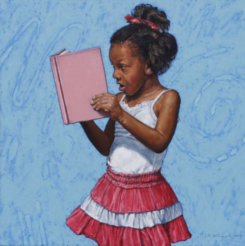 These 11 paintings by Jeff Whipple were commissioned for a new library in New Orleans. The newly constructed library replaced one that was destroyed by the flooding when the levies broke after Hurricane Katrina. His idea was to use people from the library's community as models for paintings depicting the appreciation of reading. Whipple went to New Orleans and photographed dozens of library patrons who posed with books. He selected sixteen models for the eleven oil paintings that hang throughout the 30,000 square foot library. Whipple was determined to make the paintings look like the models because library visitors will know and recognize them. He believes the portraits will provide a sense of community in an area that was severely damaged by the tragic flooding.