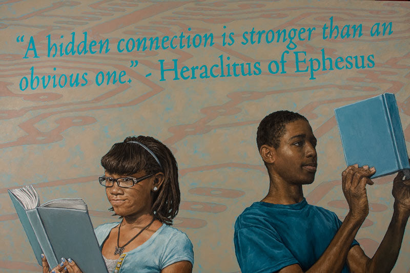 Each of the six larger paintings have scientific drawings and quotes in the background. They represent the information that a library can provide.