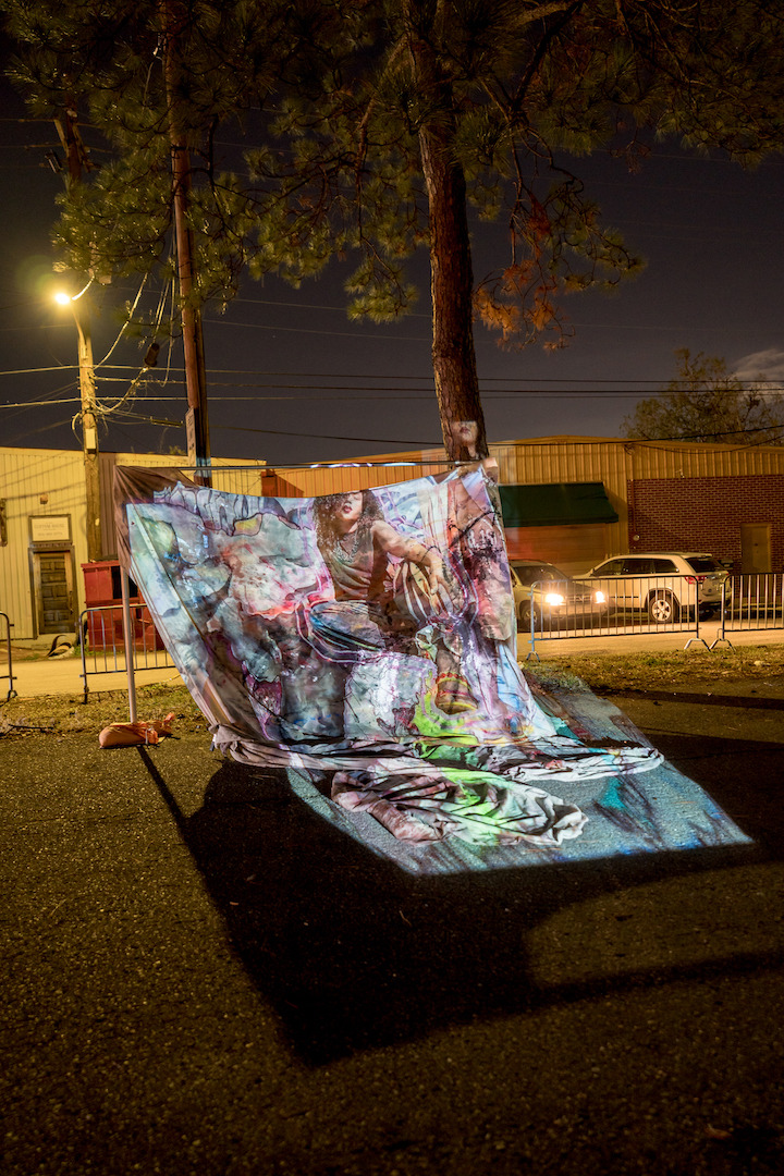 "RePainting" is a projection mapping art installation and immersive experience where spectators can be a part of the art. The installation consists of a pipe and draped art/video interactive sculpture with long pieces of painted fabric strategically placed over objects to create a warped surface on which to project video. Viewers can stand or sit inside the installation.