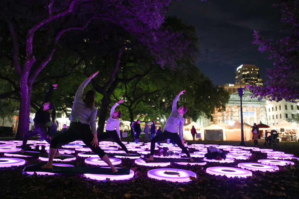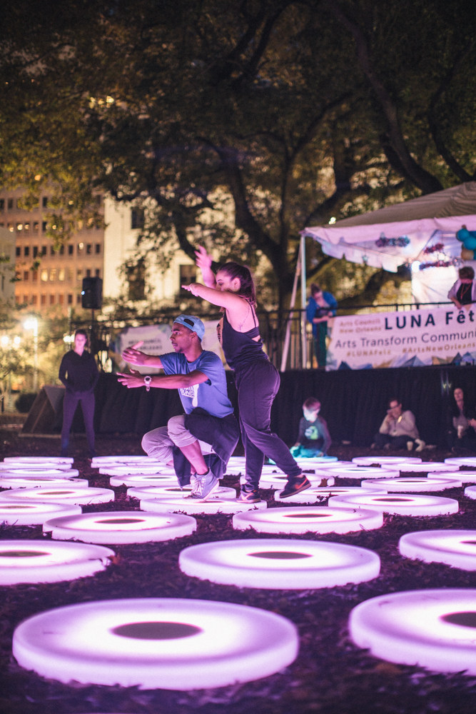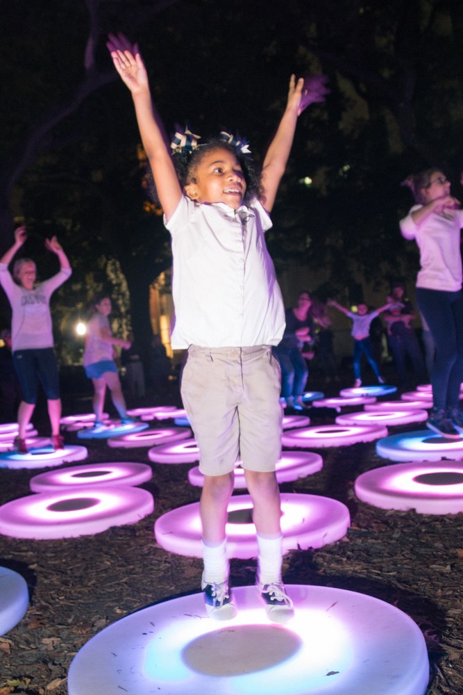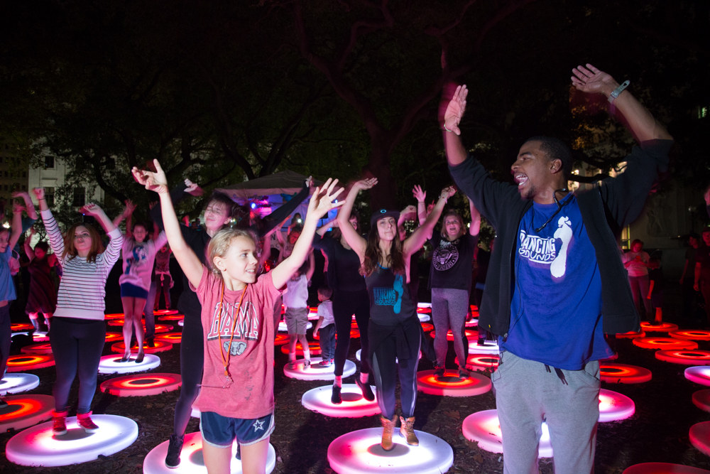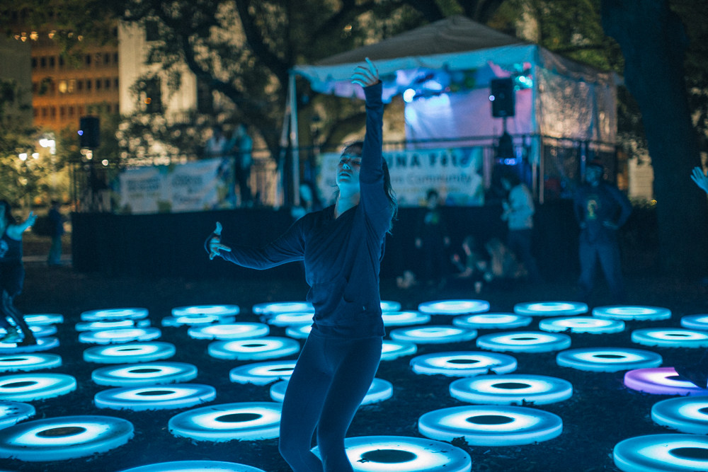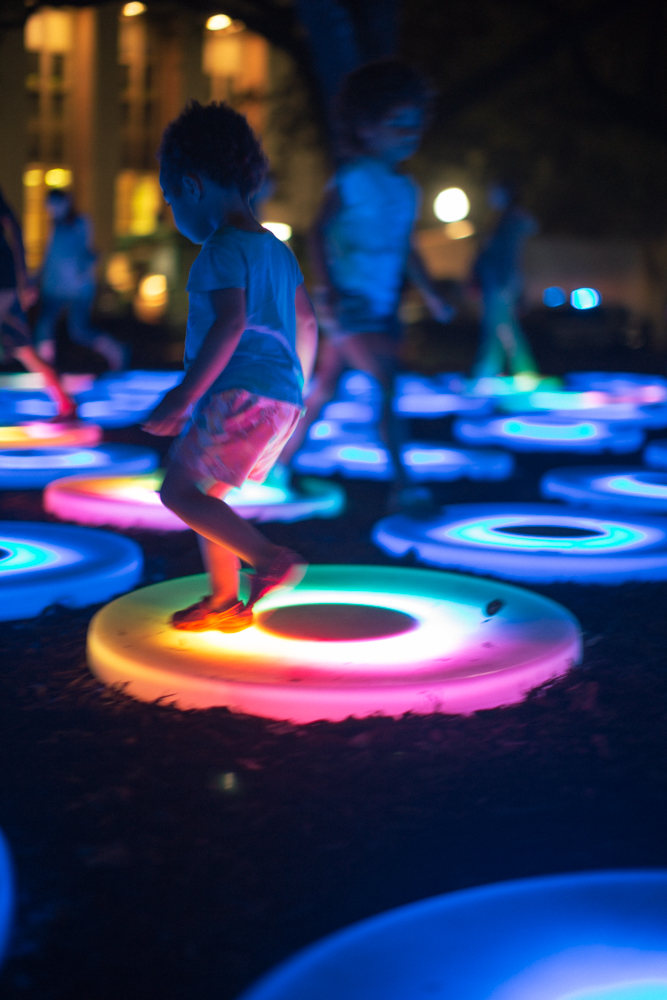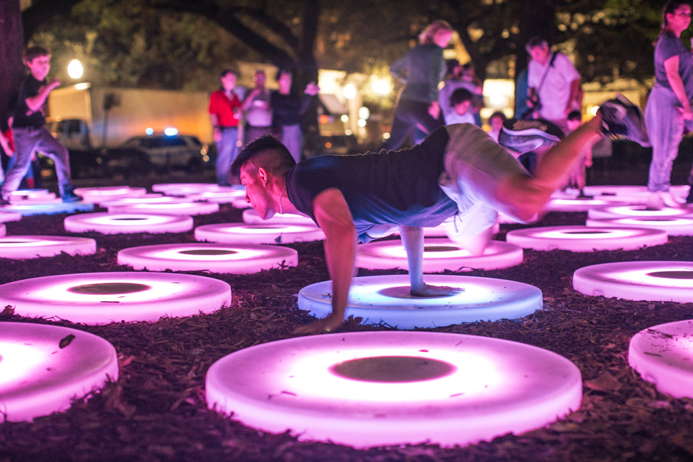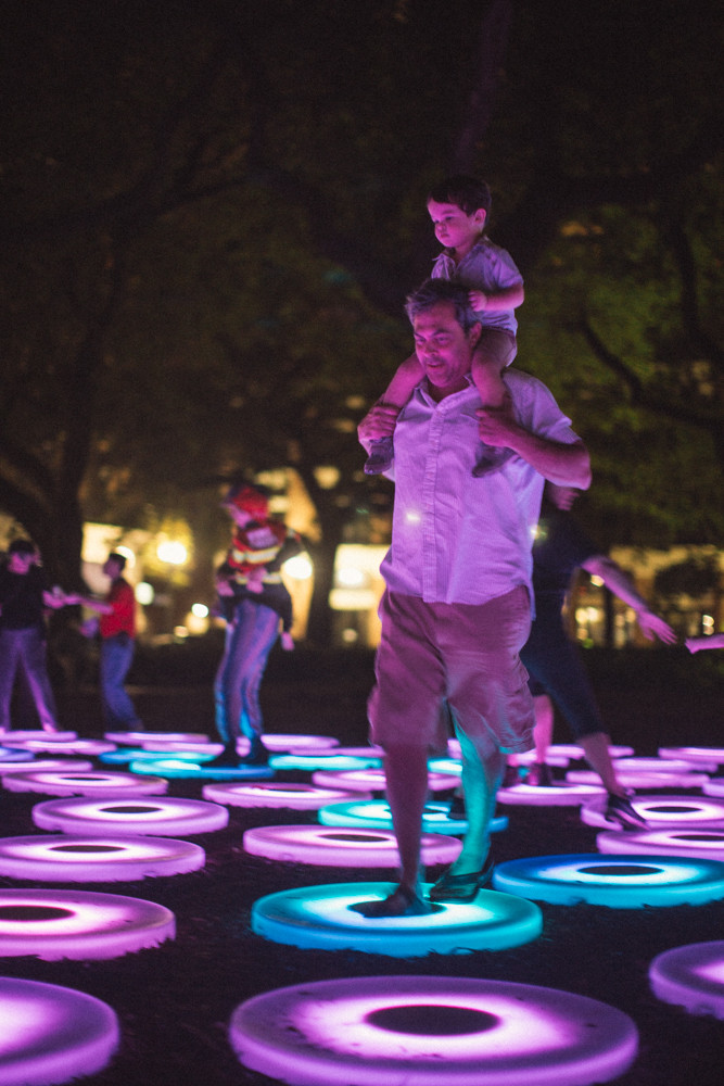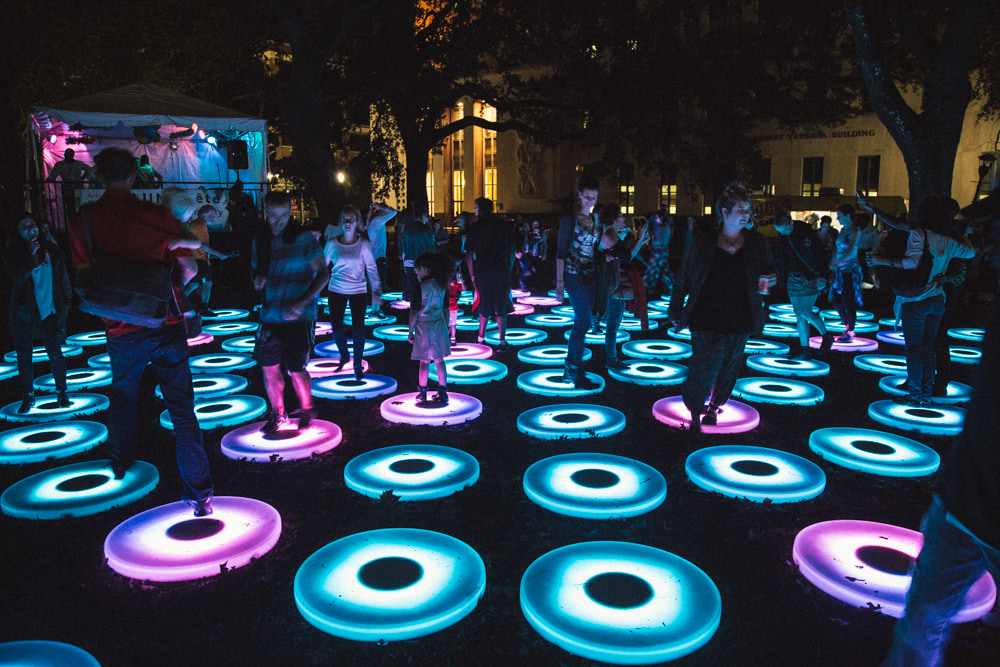The Pool consists of concentric circles created from interactive circular pads. As multiple users play in The Pool, their interactions become mesmerizing patterns of shifting and fading colors. The Pool was built and designed as a traveling work of art, it has been exhibited internationally, most recently at Abu Dhabi Science Fair in Abu Dhabi, United Emirates, the Istanbul Light Festival in Istanbul, Turkey, and at Burning Man Festival at Black Rock City, Nevada.