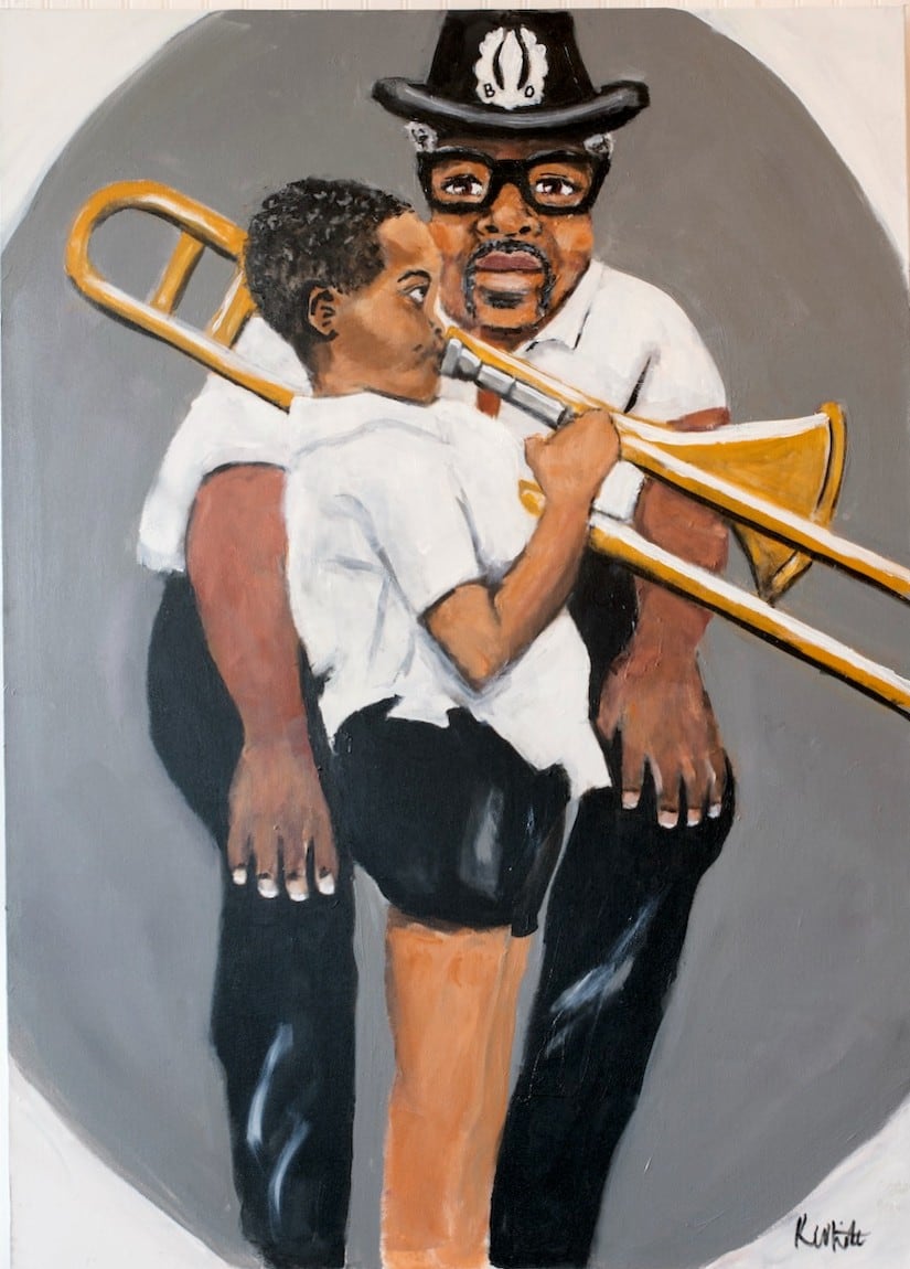 Legendary Blues guitarist Bo Diddley mentoring a young Trombone Shorty at the Jazz Heritage festival in 1998. This painting not only highlights two people who have made large contributions to the New Orleans music scene, but also depicts the importance of passing our knowledge down to younger generations.