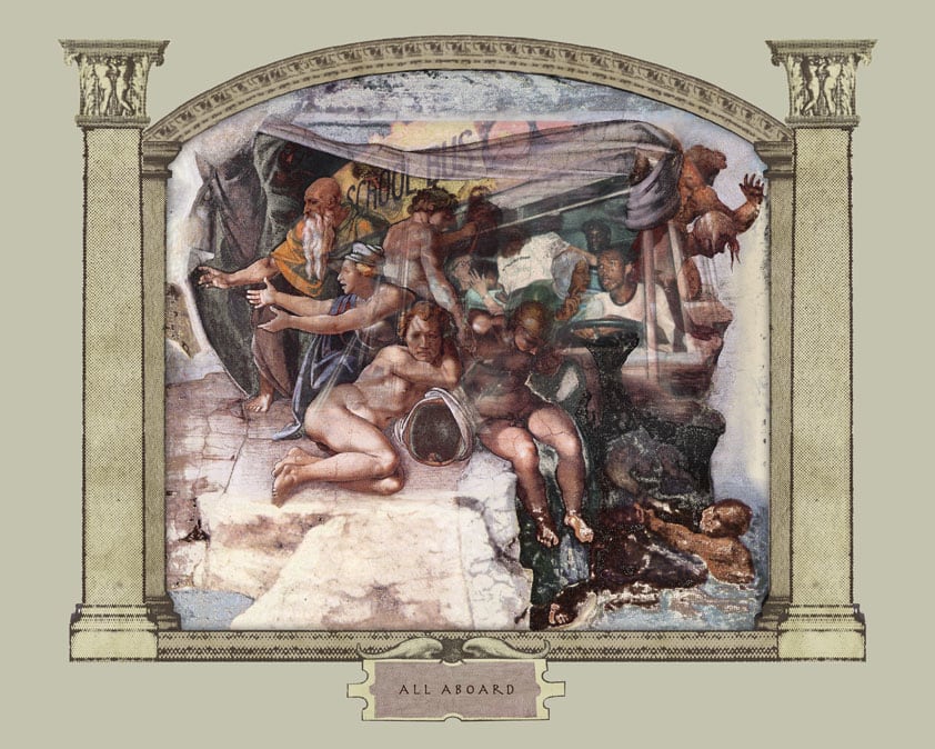 This 2500-square foot banner mural is hosted by LePavillon Hotel. A digital collage, it combines a documentary photograph of New Orleanians boarding a school bus to escape Katrina's rising waters with Michelangelo's fresco of "The Flood," painted in 1510 for the Sistine Chapel. Both narratives describe the fall or failure of a civilization and simultaneously celebrate individual acts of heroism and humanity.