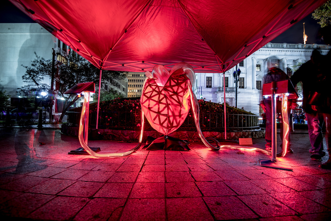 CityBeat is built to be a standalone or window installation that can be displayed in a variety of fashions suited to a space's needs. It allows strangers to connect with each other in passing by prompting them to press their hands against a window and follow the light they generate as it travels into a giant beating heart. When two people connect at the same time, the heart beats stronger and brighter, eventually filling the surrounding space with its unique light.
