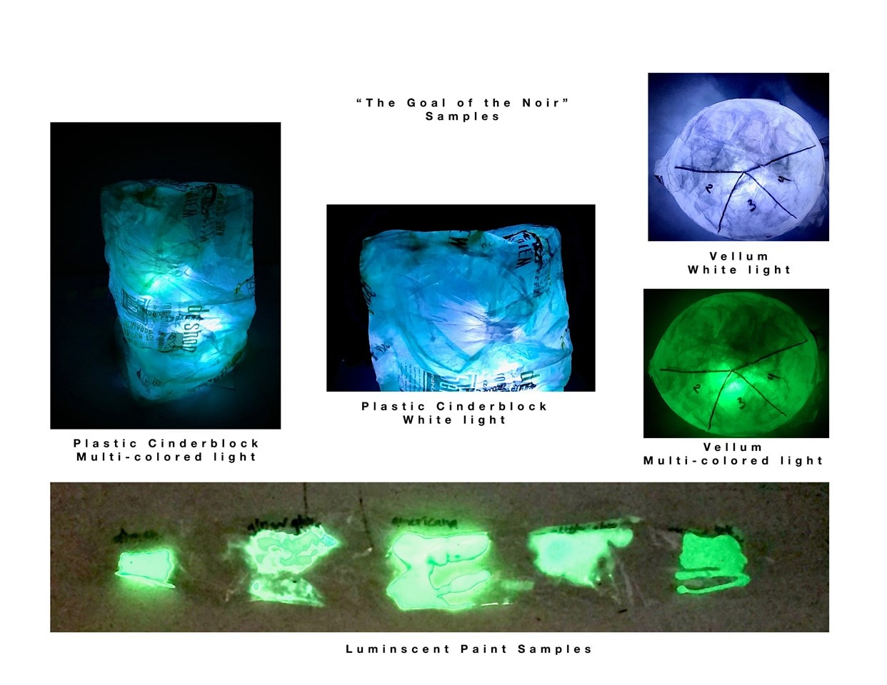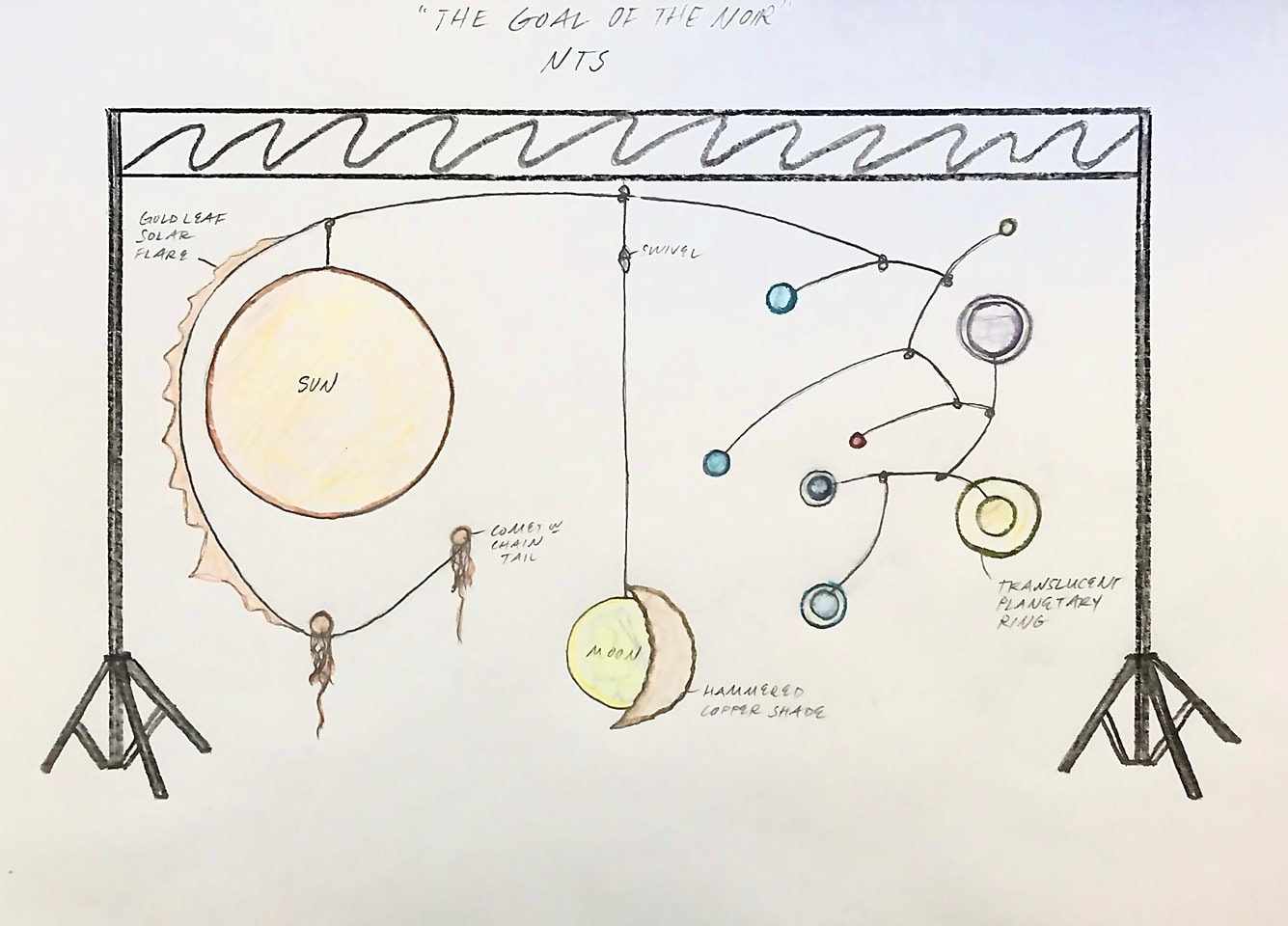 "The Goal of the Noir" is an interactive, kinetic game based on Alexander Calder's mobiles and Joan Miro's "The Gold of the Azure." Suspended by black truss, a large mobile (12'w X 9'h) consists of twelve color-changing, sculptural LED lights that represent the sun, moon, planets, and comets. Each light pairs with a remote that controls each separately with its own independent frequency. Four control stations with remotes and informational screens surround the mobile to accommodate twelve players simultaneously. Each player pushes buttons to scroll through a series of sixteen colors, unaware of which light they actually control. A fan tower keeps the piece slowly rotating.