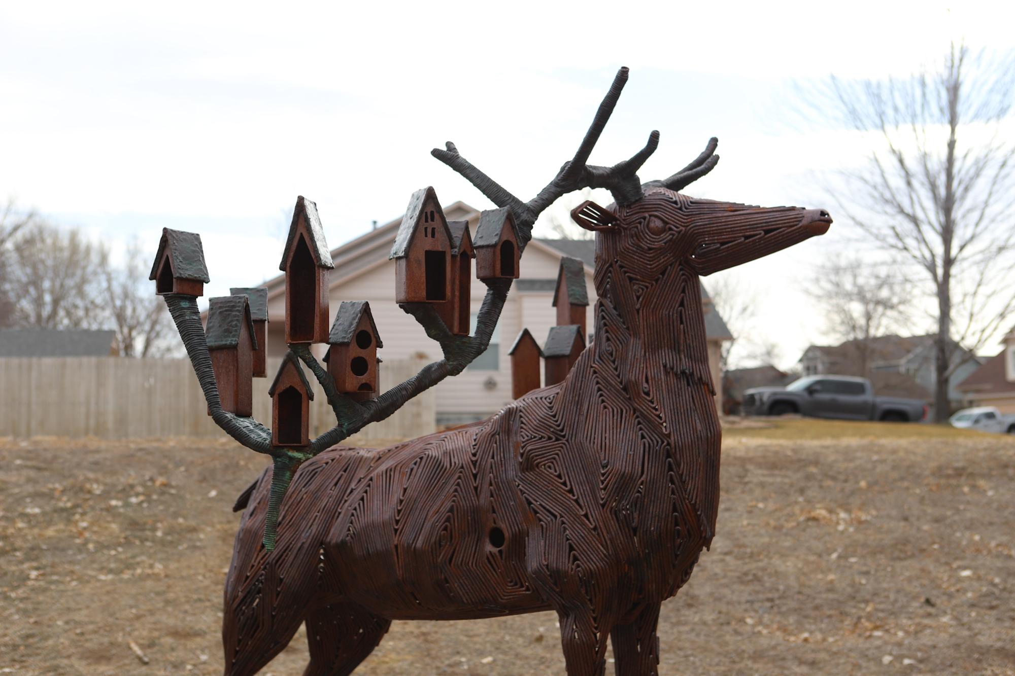 "Observe" is a sculpture of a stag overlooking the trails and natural areas of Eastlake II Open Space. This sculpture is part of Thornton's second "Pollinator Habitat" series, and is designed to provide homes for local pollinators in the houses on the stag's antlers and inside the animal's body.