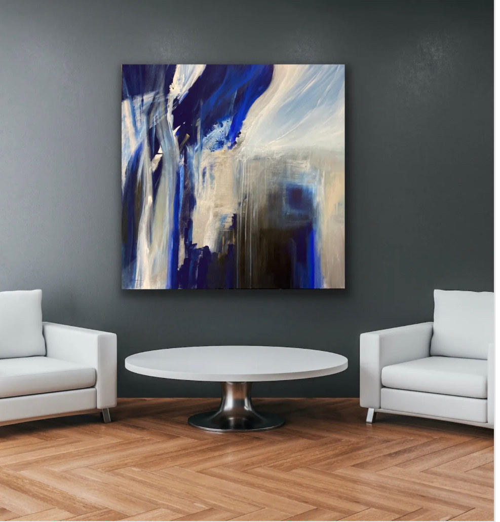 The artist exhibited this piece at Artexpo New York 2021. It includes colors of deep blue, aqua, and white over metallic accents of gold and silver with black.