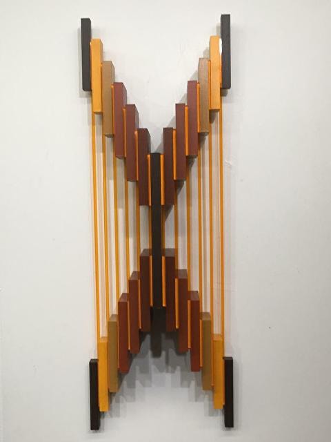 Gil has always been intrigued by color recognizing that it can create movement and affect mood. His boldly painted works gradually overwhelmed the canvas leading him to explore what happens when colors moved into the surrounding space. He began to create three-dimensional, sculptural paintings. The color pallet, crafted wood base, canvas ribbons and plexiglass sheets and rods make each piece intriguing from all angels and is affected by airflow and humidity. In this way, it becomes a form of environmental art, being constantly shaped by natural elements.