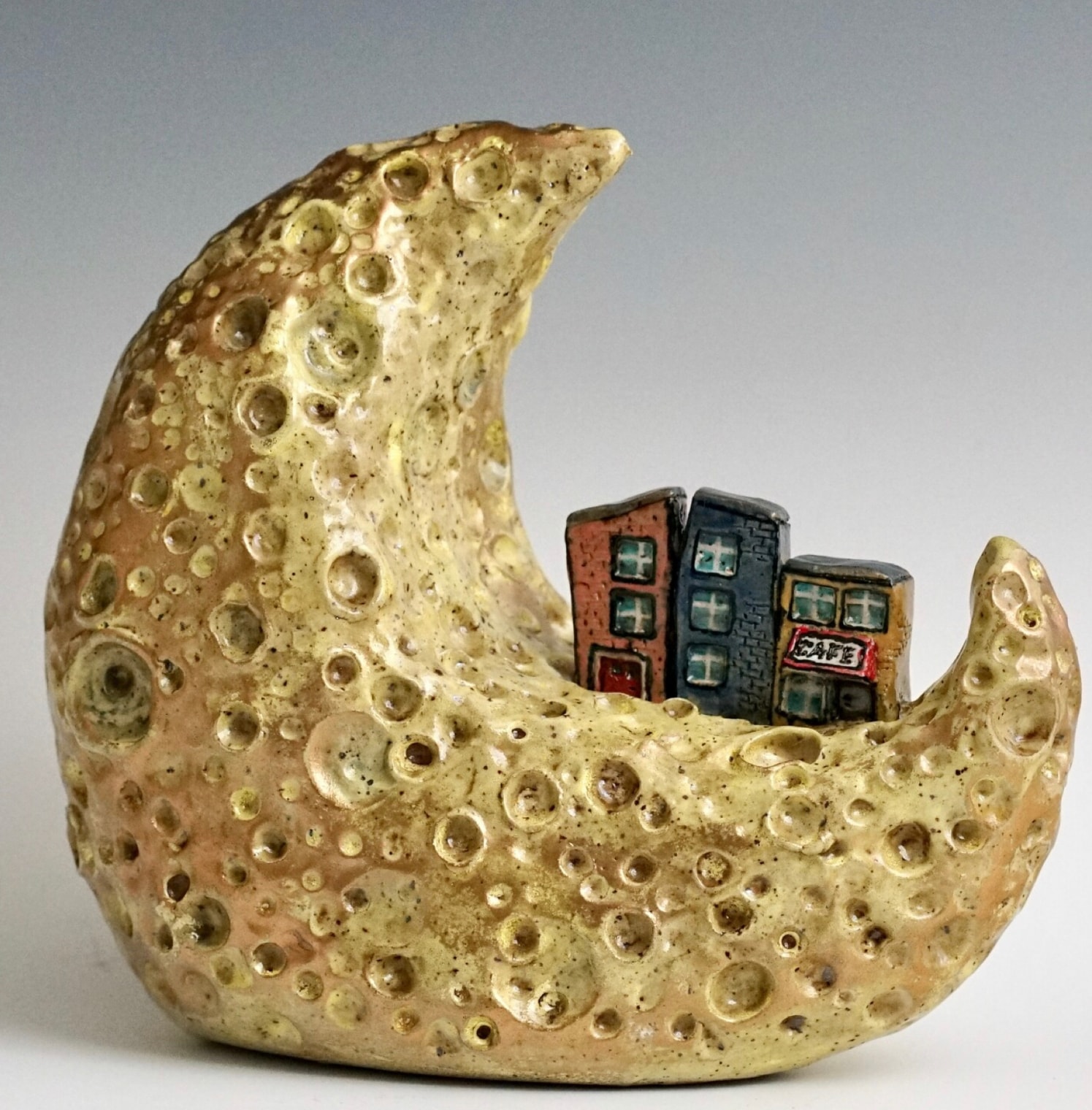 This beautiful sculpture is a one-of-a-kind, crescent moon with three Wee Little Houses cheekily perched upon it. Two tall skinnies (row houses) and a café will catch your eye and draw you in, to be sure.