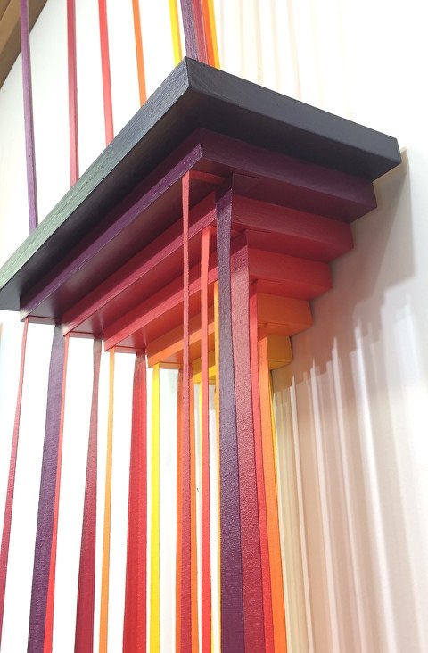 Gil has always been intrigued by color recognizing that it can create movement and affect mood. His boldly painted works gradually overwhelmed the canvas leading him to explore what happens when colors moved into the surrounding space. He began to create three-dimensional, sculptural paintings. The color pallet, crafted wood base, canvas ribbons and plexiglass sheets and rods make each piece intriguing from all angels and is affected by airflow and humidity. In this way, it becomes a form of environmental art, being constantly shaped by natural elements.