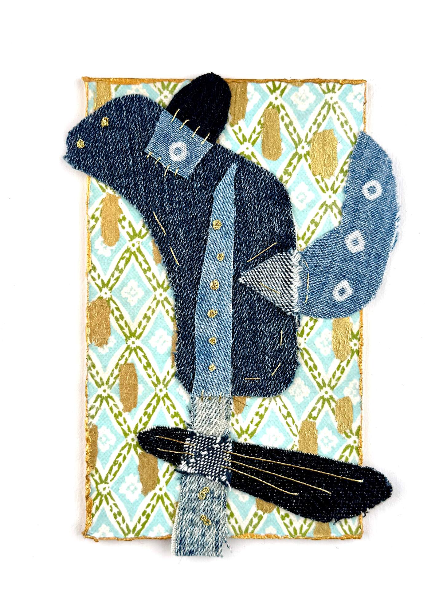 This mixed-media textile piece features hand-stitched denim and blue fabric shapes layered over a vintage Reader’s Digest book cover, softened with a layer of tissue paper. The organic forms seem to float and interact, creating a whimsical, abstract landscape. Gold thread accents weave through the composition, adding a sense of movement and quiet energy.