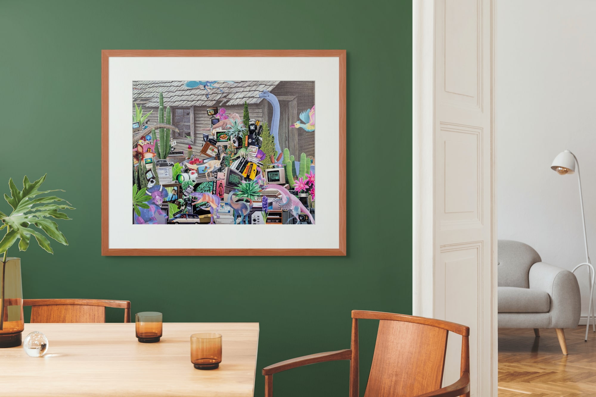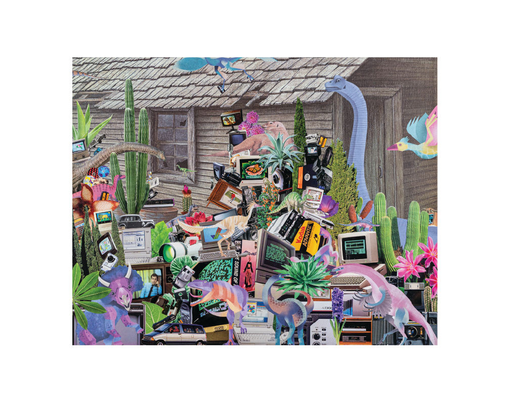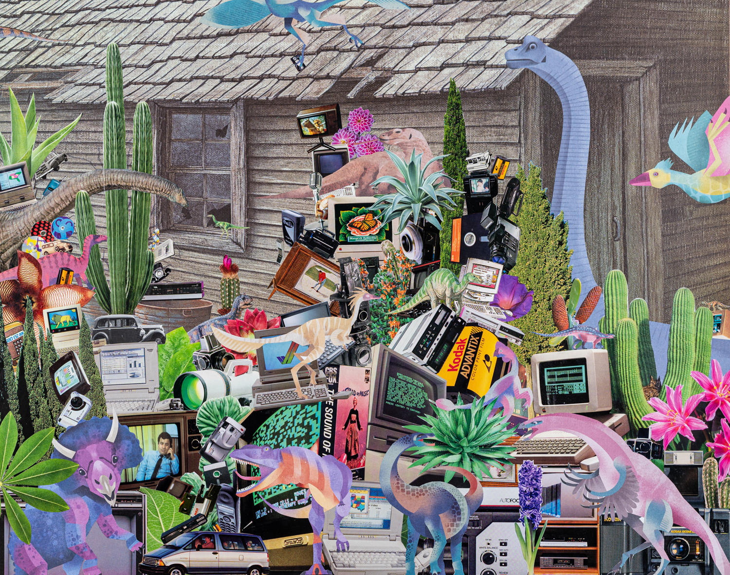 Story: Dinosaurs stroll among VHS tapes, cassette players, early computers, and long-forgotten gadgets — relics that once felt like the height of innovation. For many, these fragments carry a nostalgic wink, reminders of childhood wonder and the pace of change. Yet the piece is not only about what disappears, but also about what evolves. Just as species adapt and technology shifts, we too are always in transformation. With humor and tenderness, Contemplating Extinction invites us to remember that obsolescence is not only loss — it is also the opening for something new to emerge.