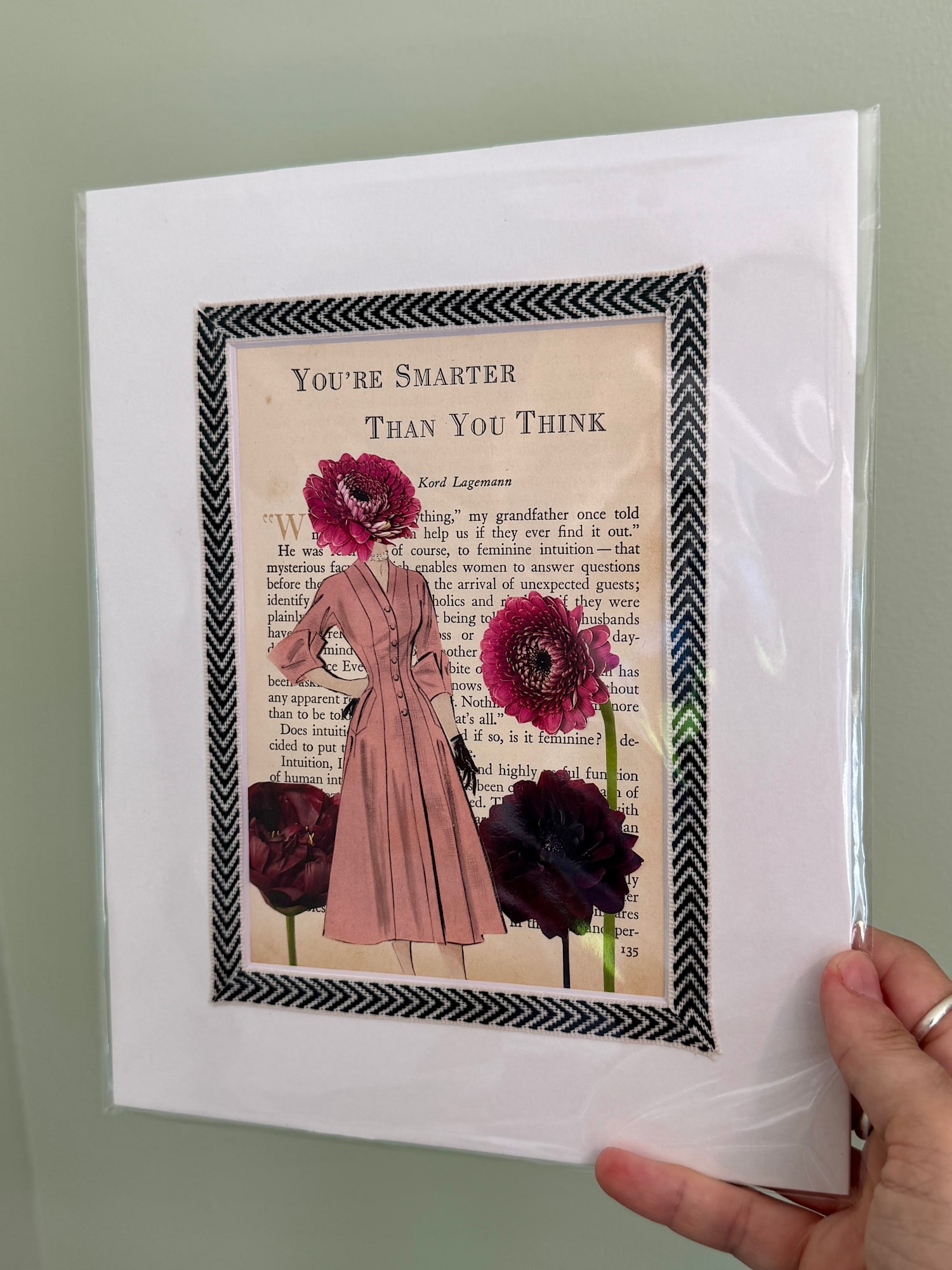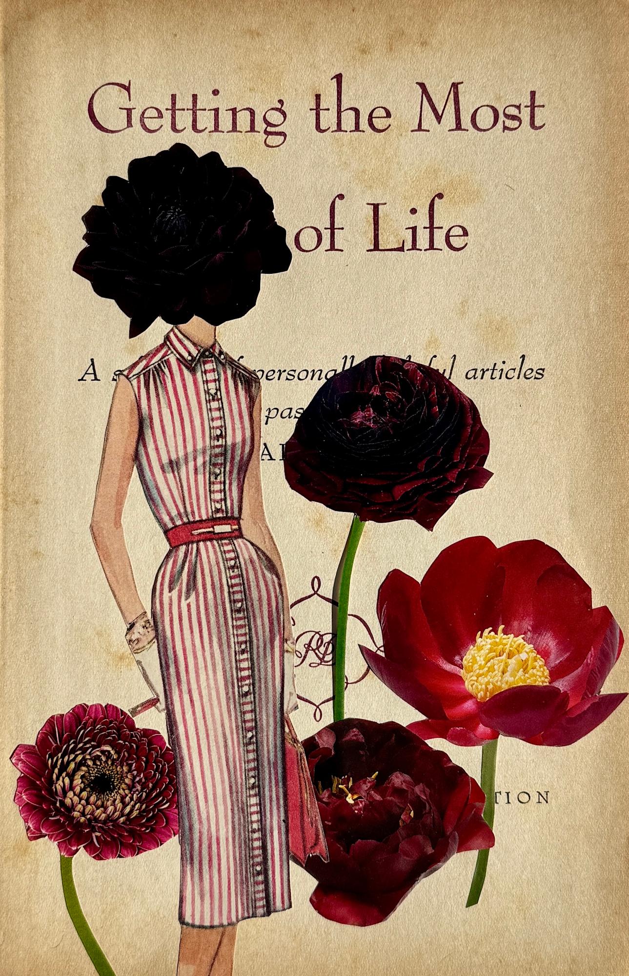 Step into the Garden Party — a whimsical series of hand-cut paper collages that blend vintage charm, quiet humor, and a touch of magic. Each piece is created from the pages of a 1955 Reader’s Digest book, paired with vintage sewing pattern figures and blooms clipped from an old book of flowers. The result? Elegant, tongue-in-cheek portraits of women who embody wisdom, resilience, and unapologetic authenticity — floral-headed muses reminding us to breathe, say no, and stop worrying.