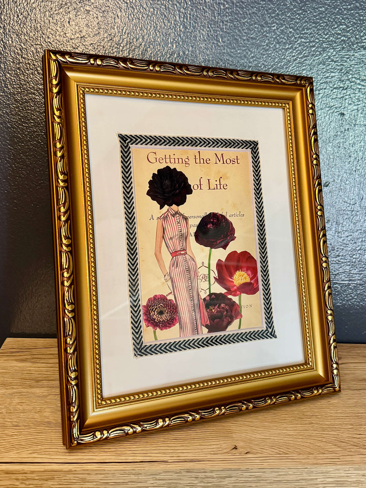 This version is framed in a new-but-vintage-style antique gold frame, accented with a crisp archival mat trimmed in black-and-white decorative ribbon. The combination of floral-headed muses, old-world gold, and playful detail makes this a perfect conversation piece for art lovers with a sense of humor and heart.